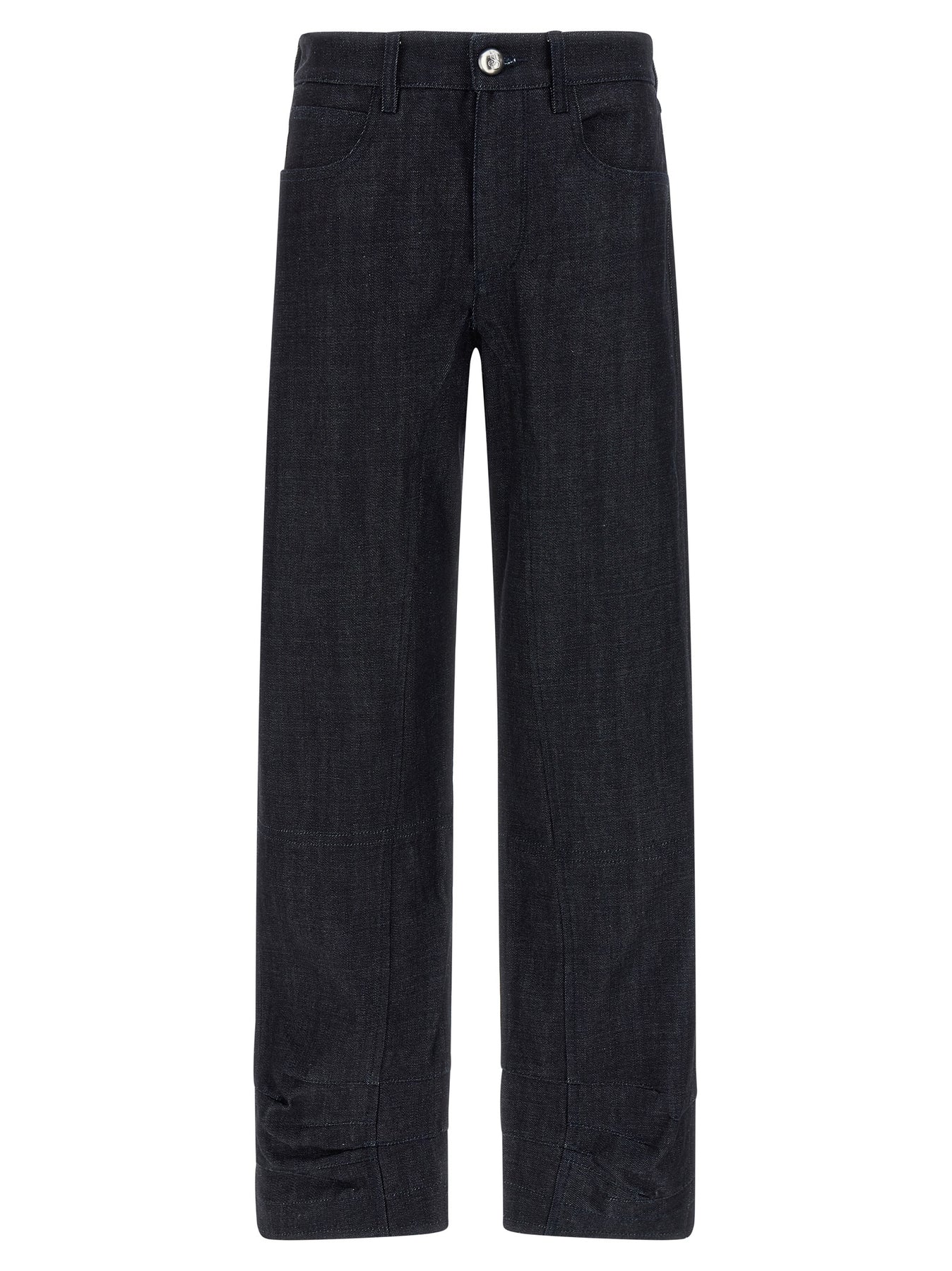 High-waisted cotton denim jeans with zip and button closure, five pockets, raw cut hem, and leather logo label at the back.