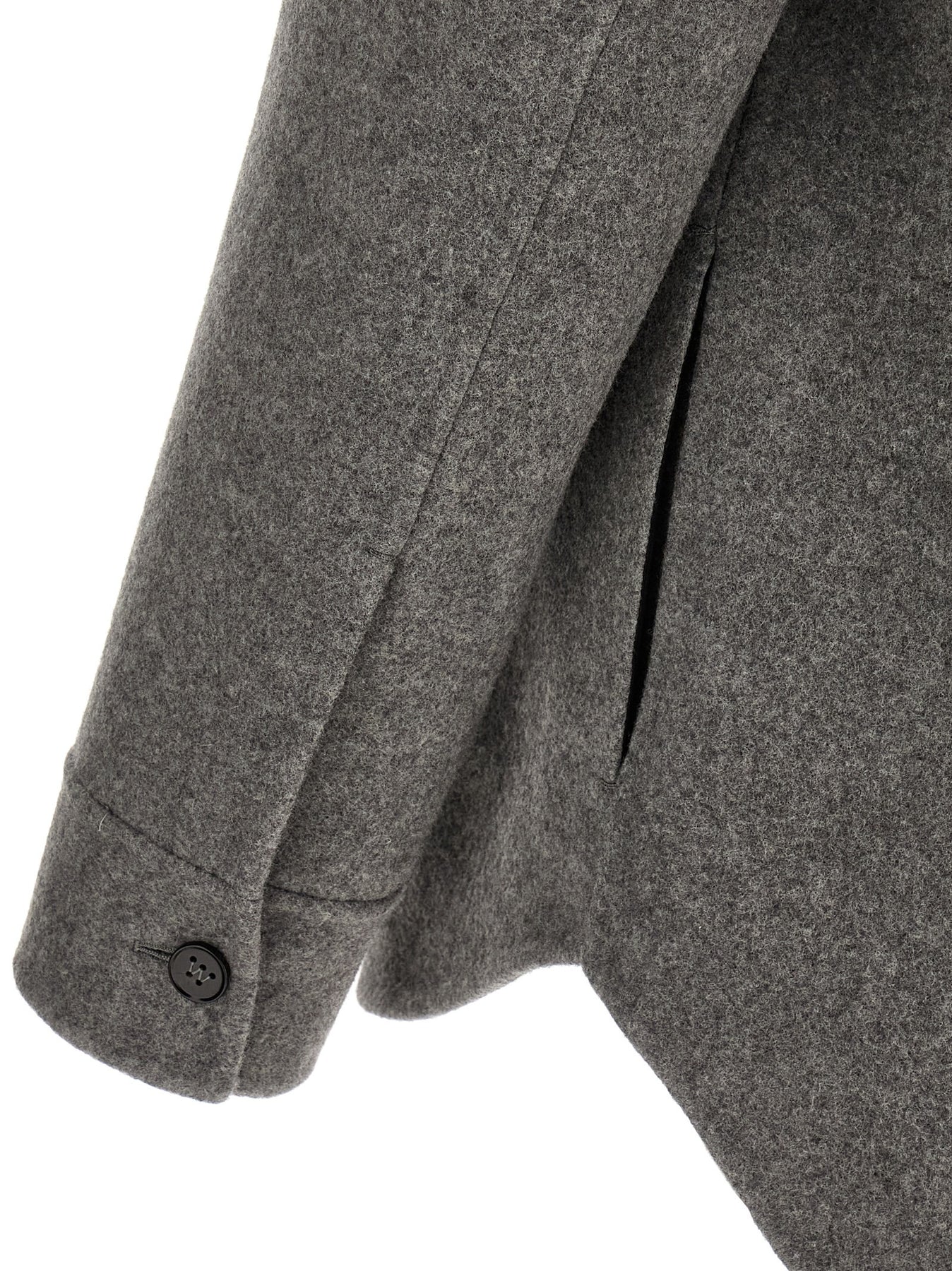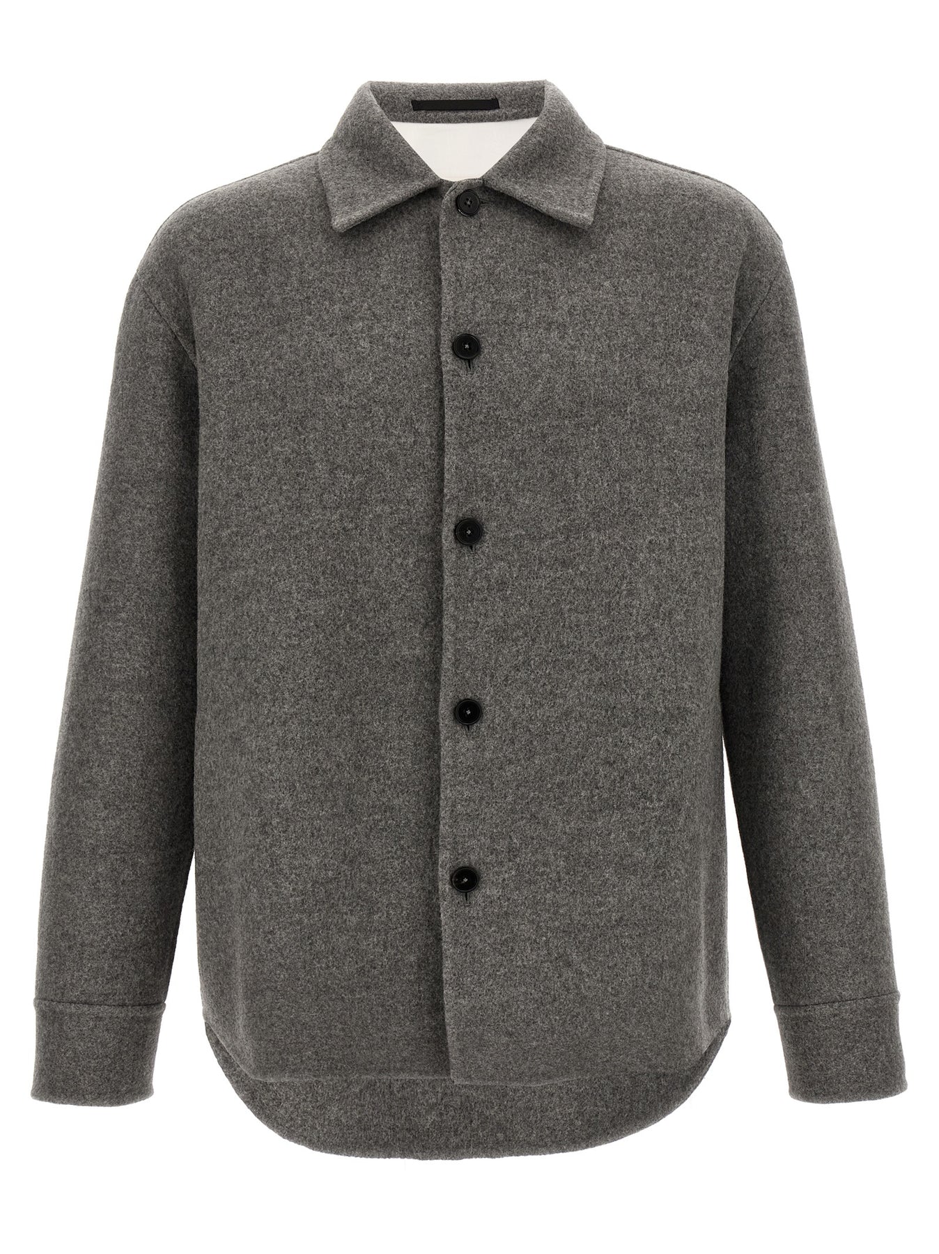 Heavy virgin wool overshirt, unlined, front button closure, long cuffed sleeves, pockets.
