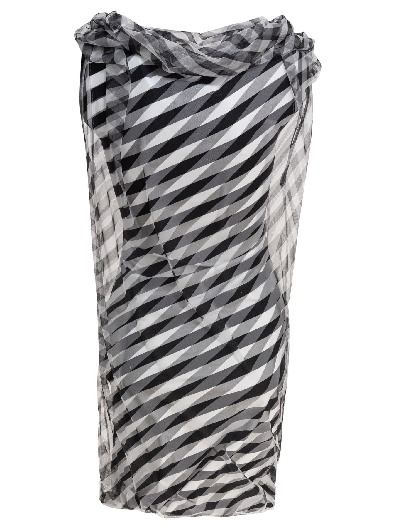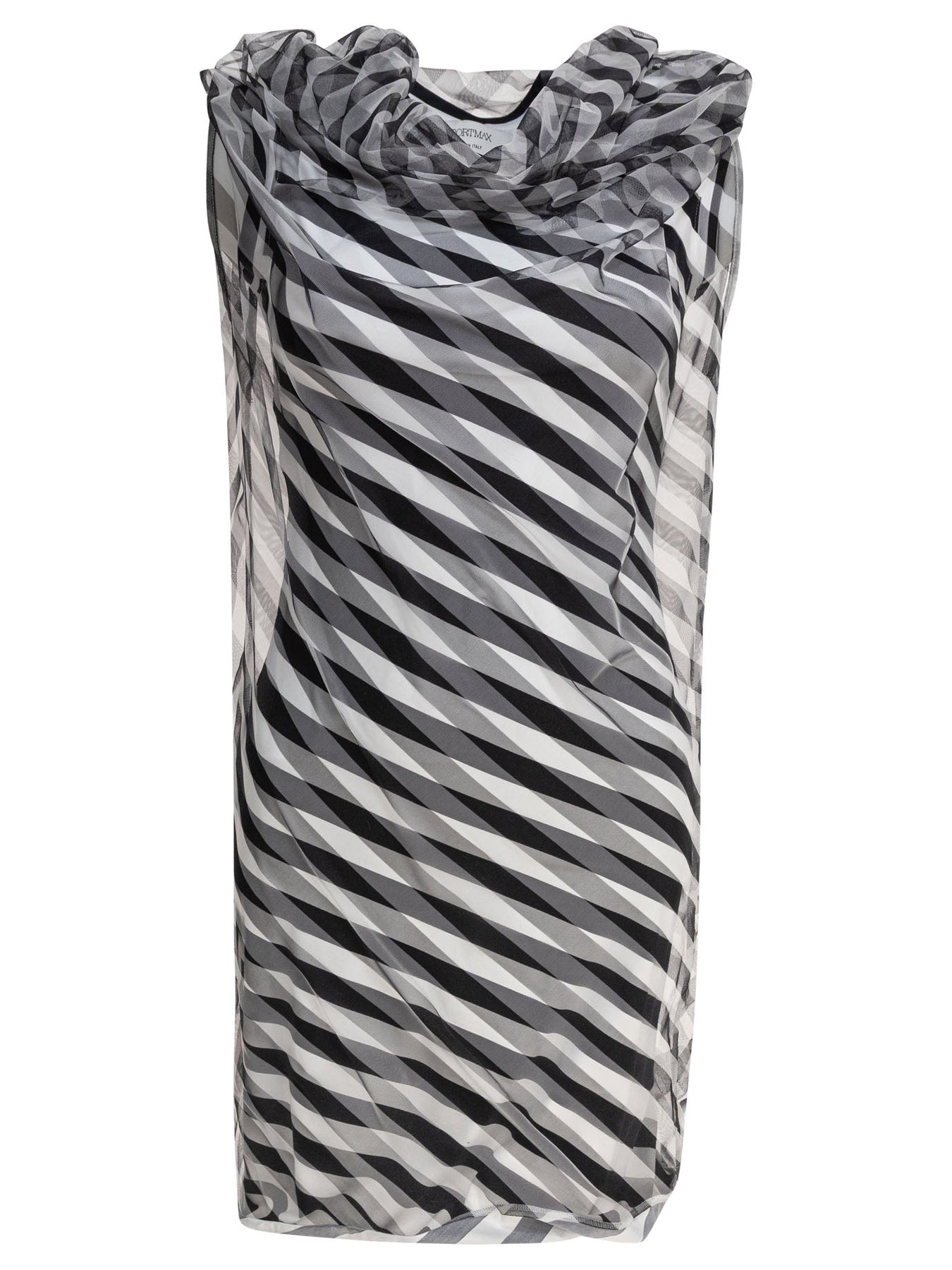 Draped striped Max Mara Sportmax dress made with contrasting fabric overlays between opaque and transparent surfaces. Vertical lines run through the entire structure, intersecting with draping and pleats that shape the profile. Straight silhouette, sleeveless structure and circular neckline, with semi-transparent outer layer adding visual depth while keeping the fabric light and flexible. The main fabric supports the construction of the garment. || - Striped - Draped dress - Sleeveless - Transparent layer - Round neckline - Regular fit