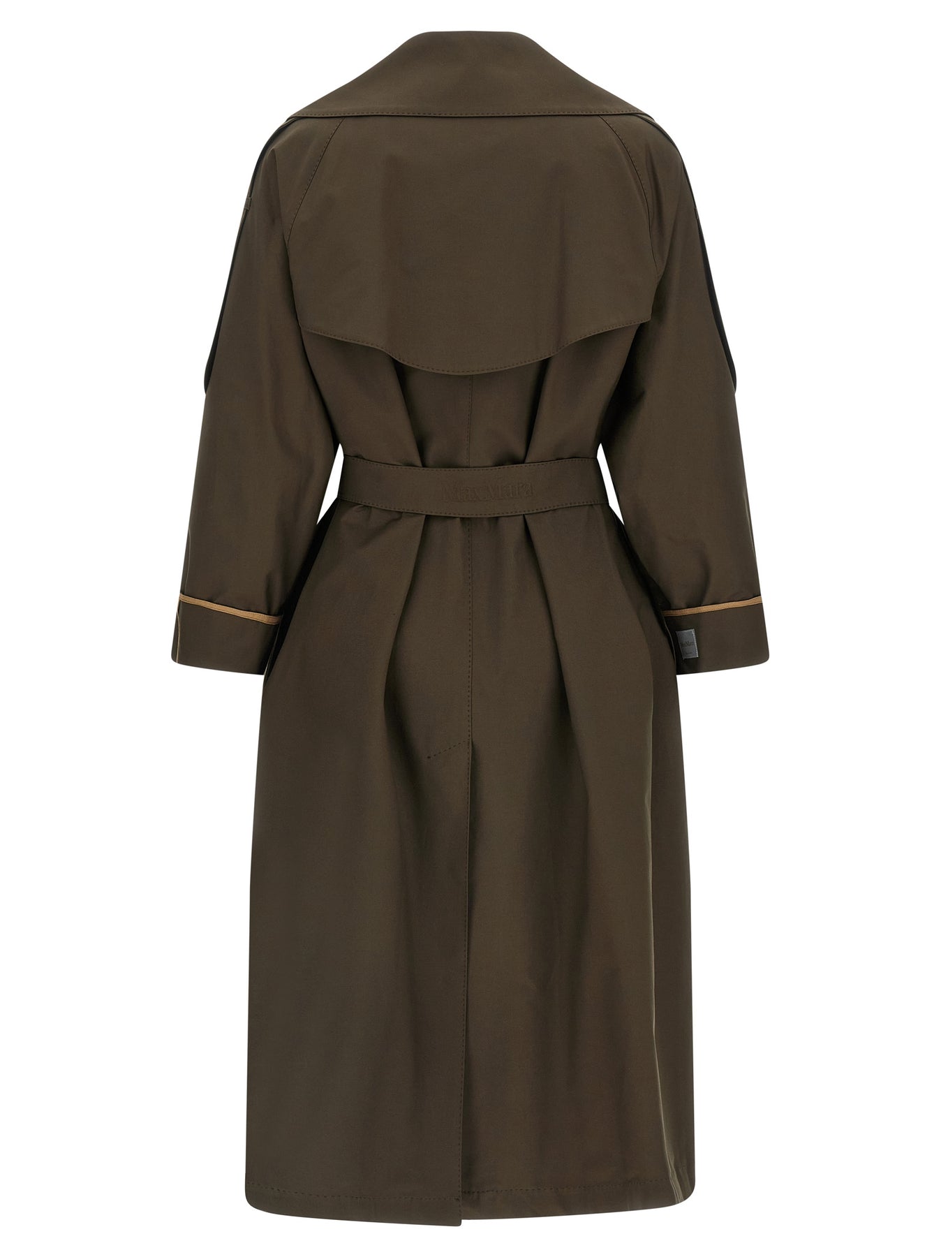 'MtcUtrench' trench coat in waterproof cotton blend twill crafted to perfection, robe style, flared silhouette, front flared, wide lapel collar, pockets, shoulder wing, long raglan sleeves with contrast stitched turn-up, cape and wide back split, taffeta half-lining and jacquard logo ribbon, belt with removable embossed logo.