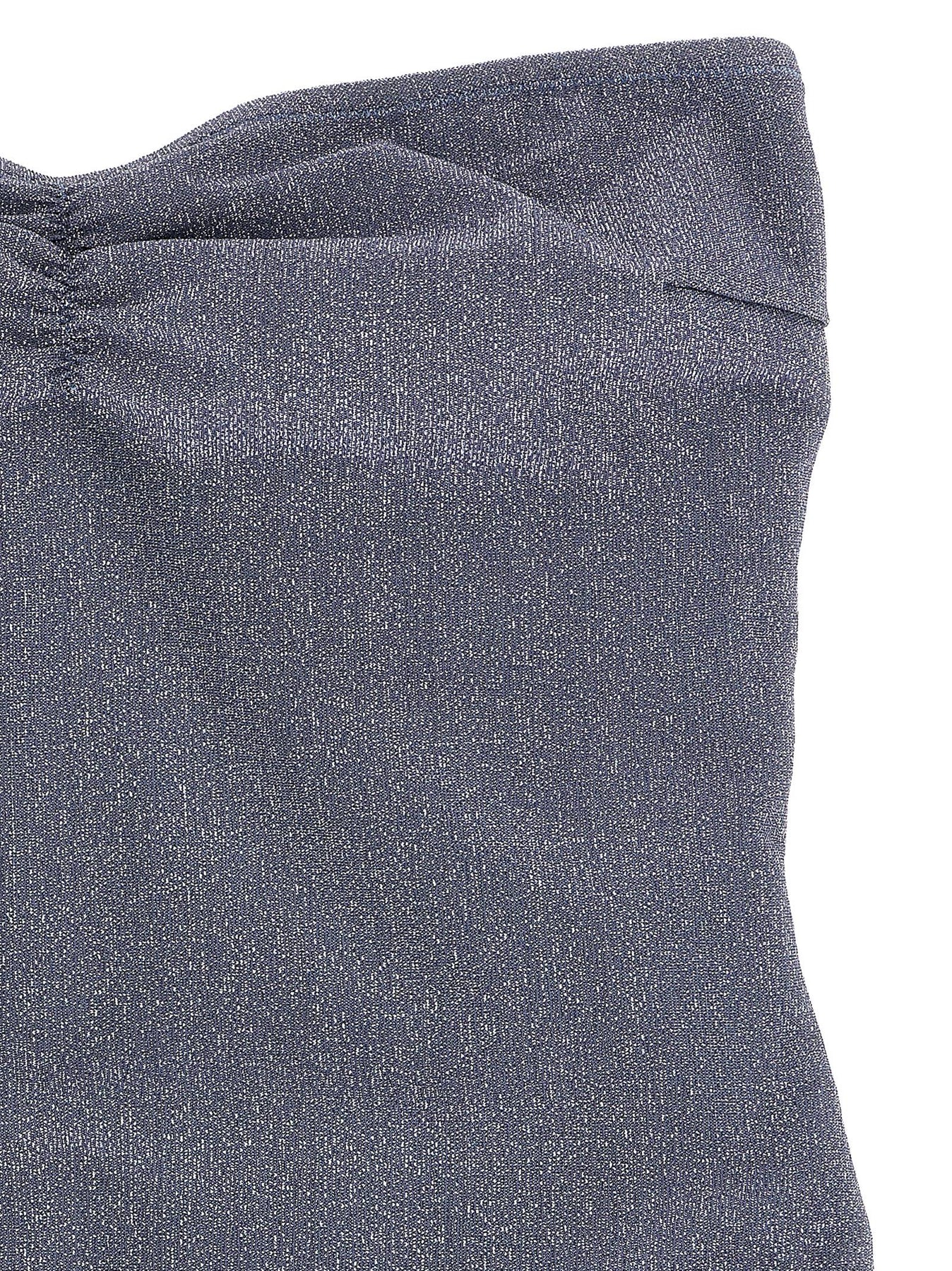 'Soleil' off-the-shoulder lurex fabric one-piece swimsuit, curled heart neckline, back logo patch, classic cover bottoms.