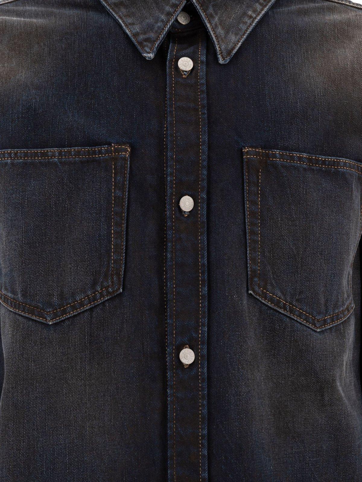 Dark blue denim shirt relaxed fit by Acne Studios featuring dropped shoulders, extra long sleeves, chest patch pockets and a front button fastening.