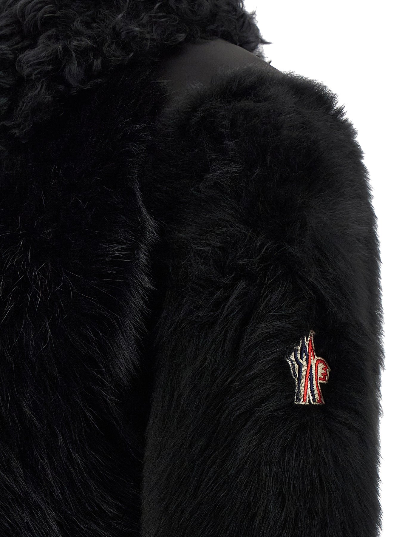 'Valdivian' short down jacket in long-haired sheepskin and polyester with micro gabardine details, goose down padded rainwear lining, shearling shearling collar, YKK® AquaGuard® zip closure and snap buttons, pockets, long sleeves with windproof gaiter and logo patch appliqué, inner gaiter on the hem, removable tape belt with leather glove hook detail.