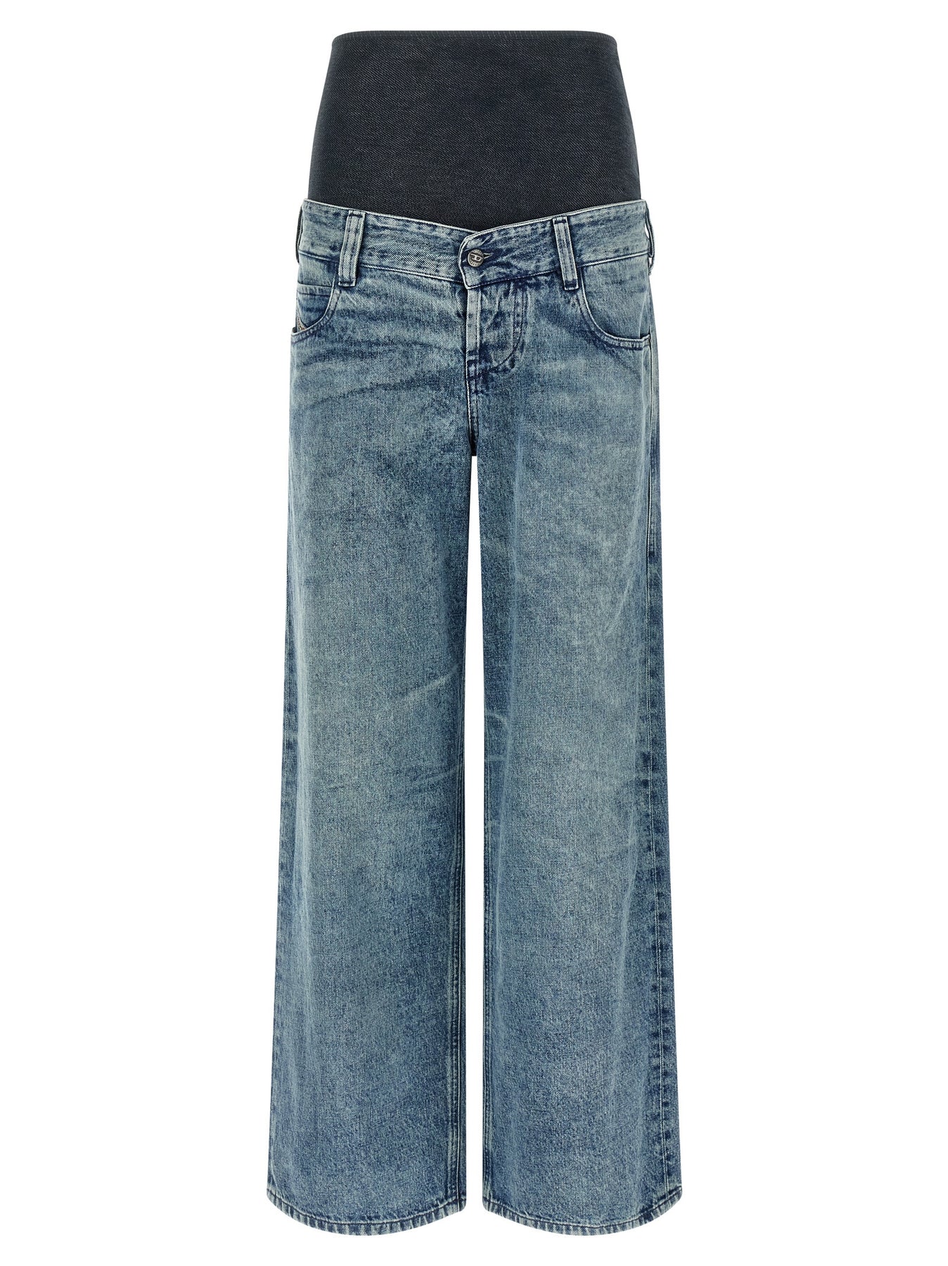'D-Eni-F-Fsh1' stonewashed cotton and hemp denim jeans with whisker and high baschina that wraps around the waist in technical material fabric, low crotch, wide and straight leg, front button closure, five pockets, back leather logo tag.