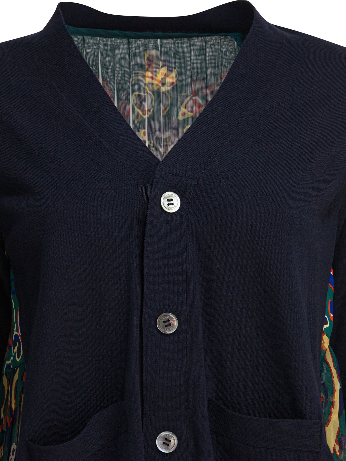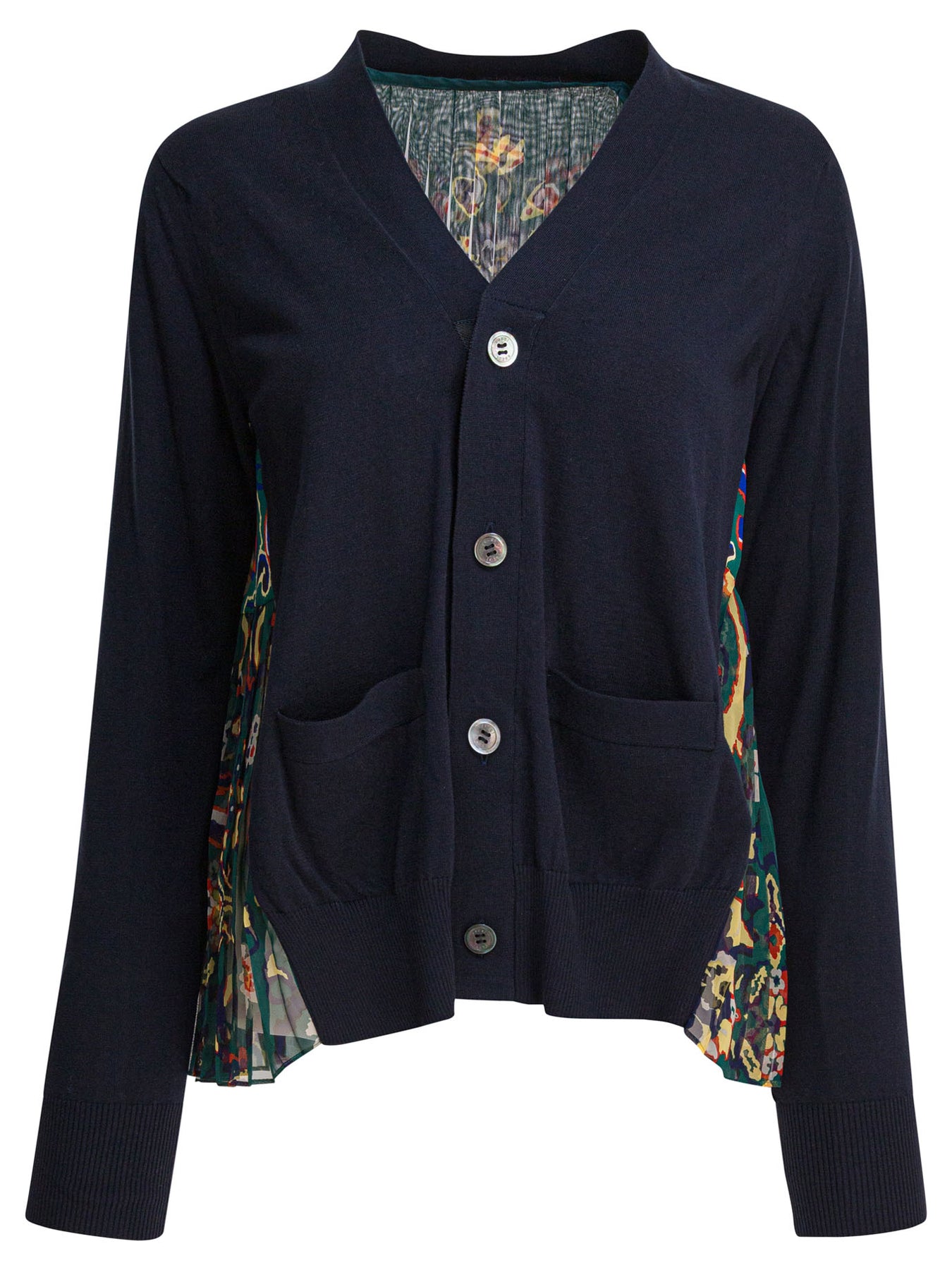 Sacai's floral print cardigan represents a perfect harmony between elegance and comfort, ideal for the modern woman looking for a unique garment to enrich her wardrobe. Thanks to its fine workmanship and accurate details, it proves to be extremely versatile and suitable for a variety of occasions. The pleated back lends a touch of originality, while the cardigan's structure ensures practicality and style. Its flowing lines and cleverly designed cut enhance the silhouette without sacrificing comfort. || - Floral - Long sleeves - Regular fit - Pleated back - Two patch pockets - Button closure - V-neckline - Ribbed hem and cuffs