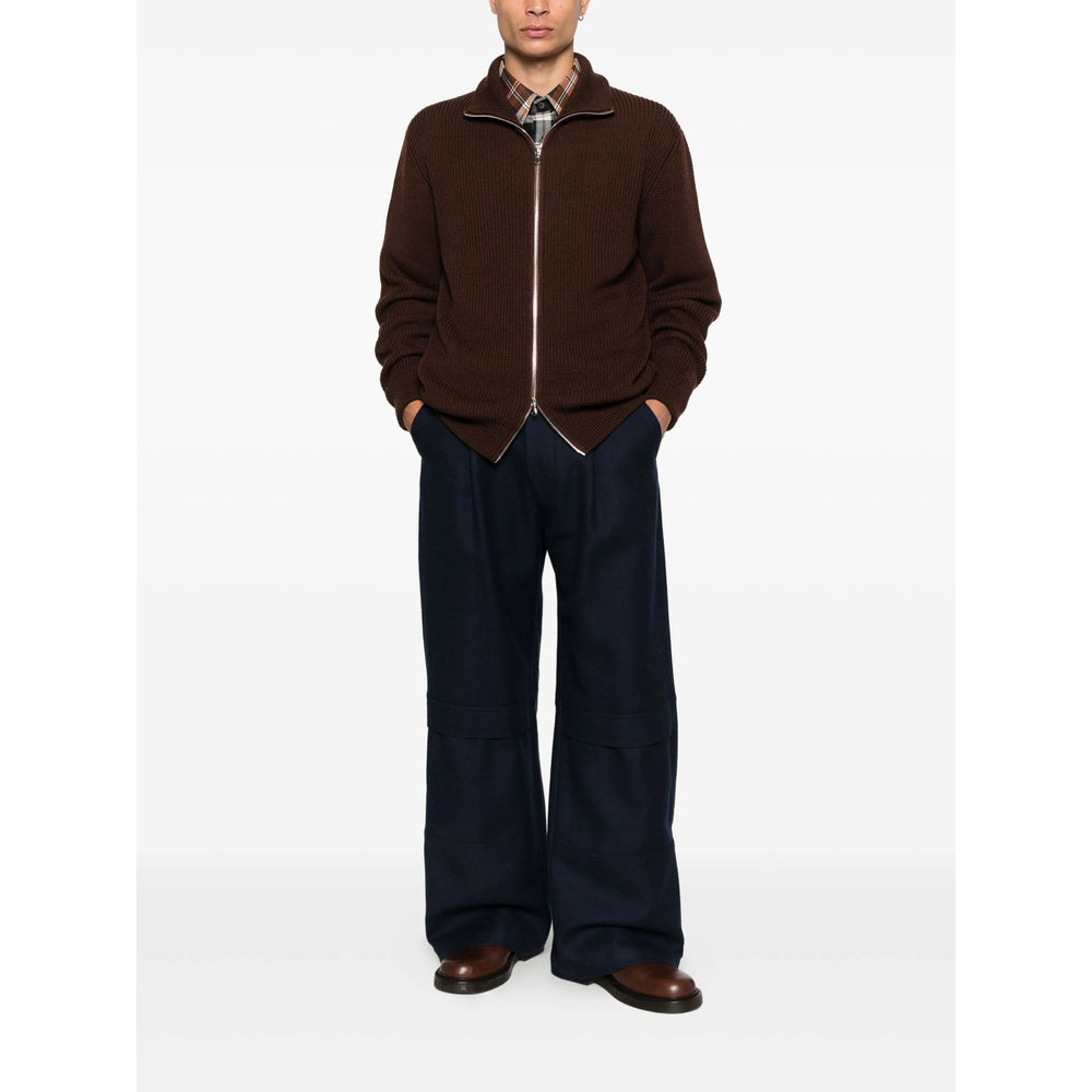 brown ribbed knit high neck front zip fastening long sleeves straight hem