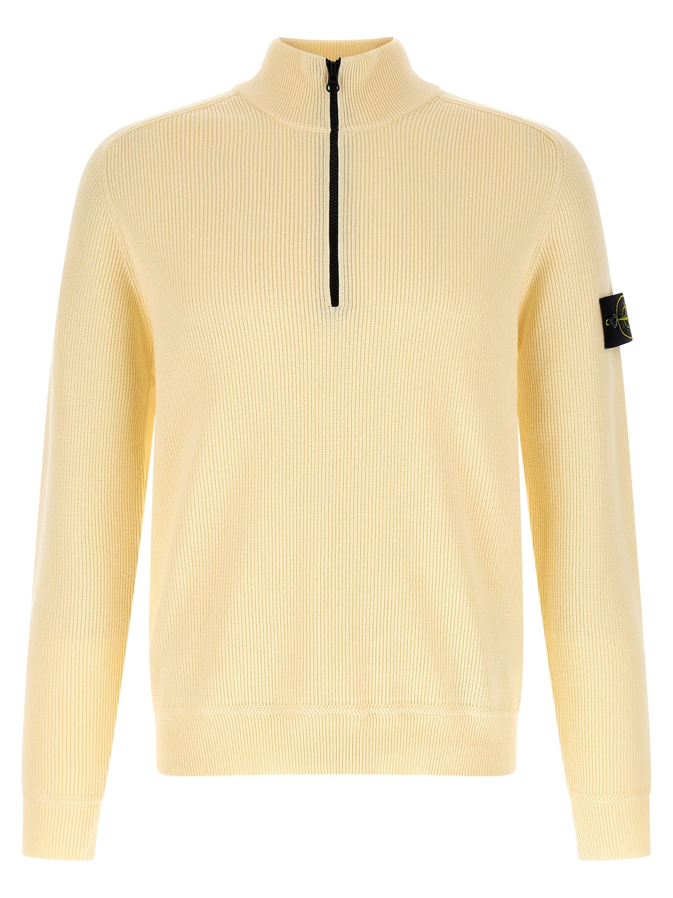 '5100124' ribbed cotton sweater with 12 fineness, high neck, half zip, long raglan sleeves with cuffs and logo badge. SUSTAINABLE: This product is made with organic cotton.
