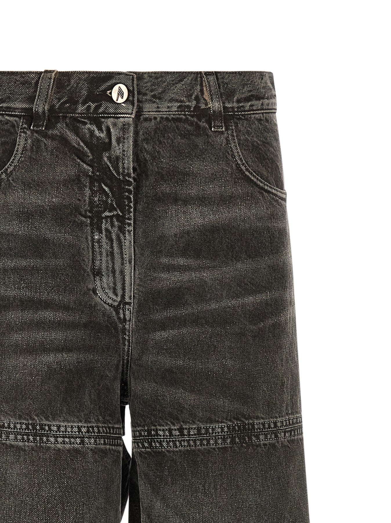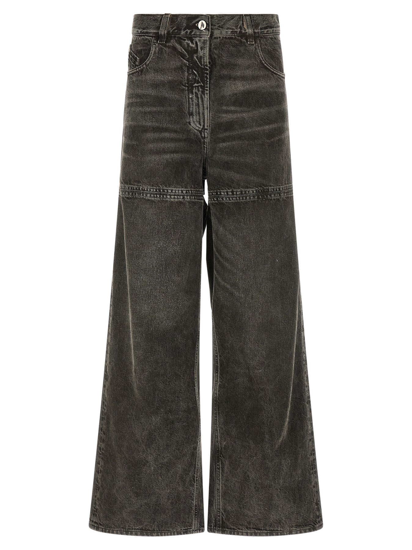 Stonewashed cotton denim jeans, low crotch, back cut-out details, wide straight leg, front zip and button closure, five pockets, leather logo tag.