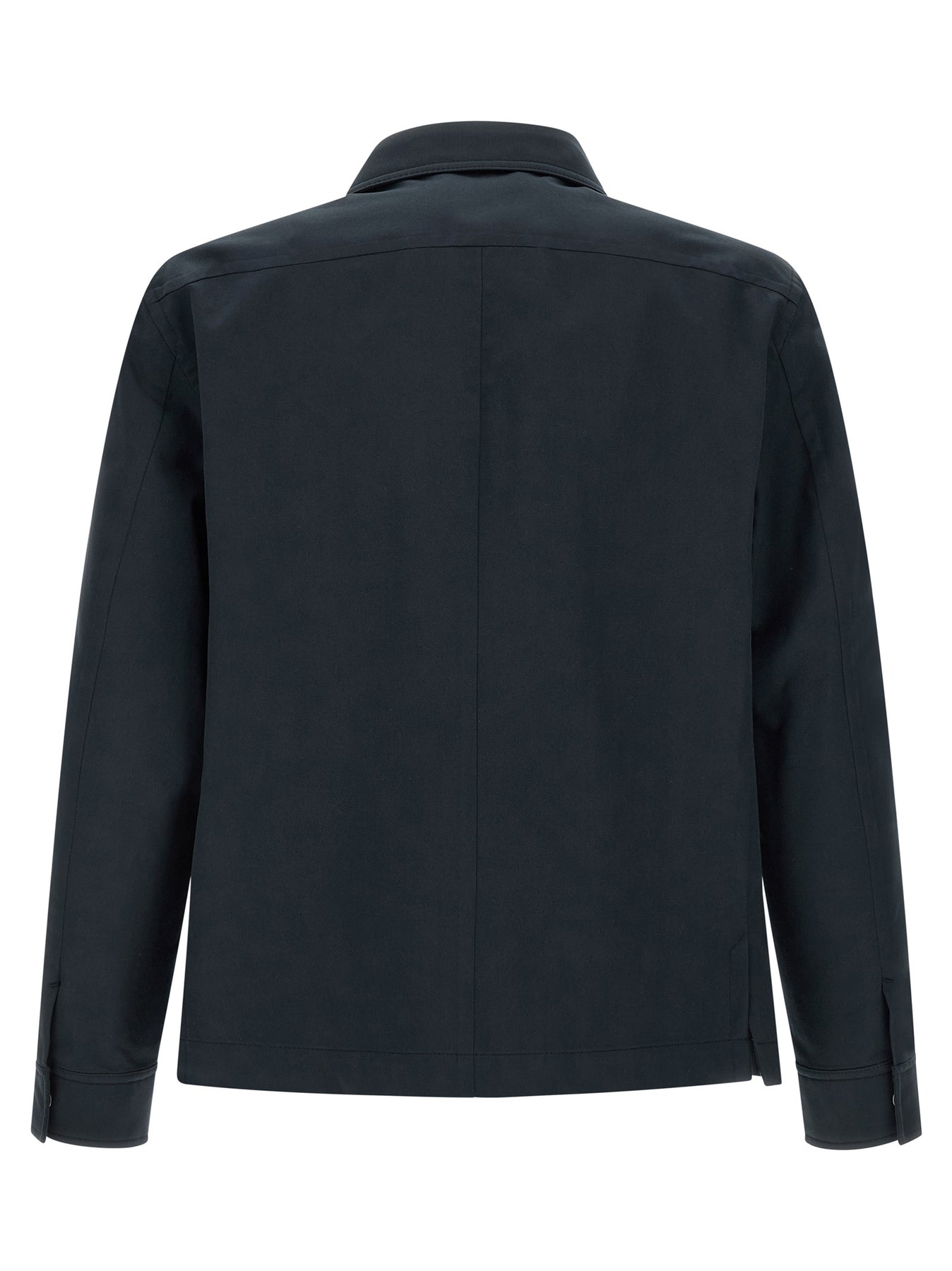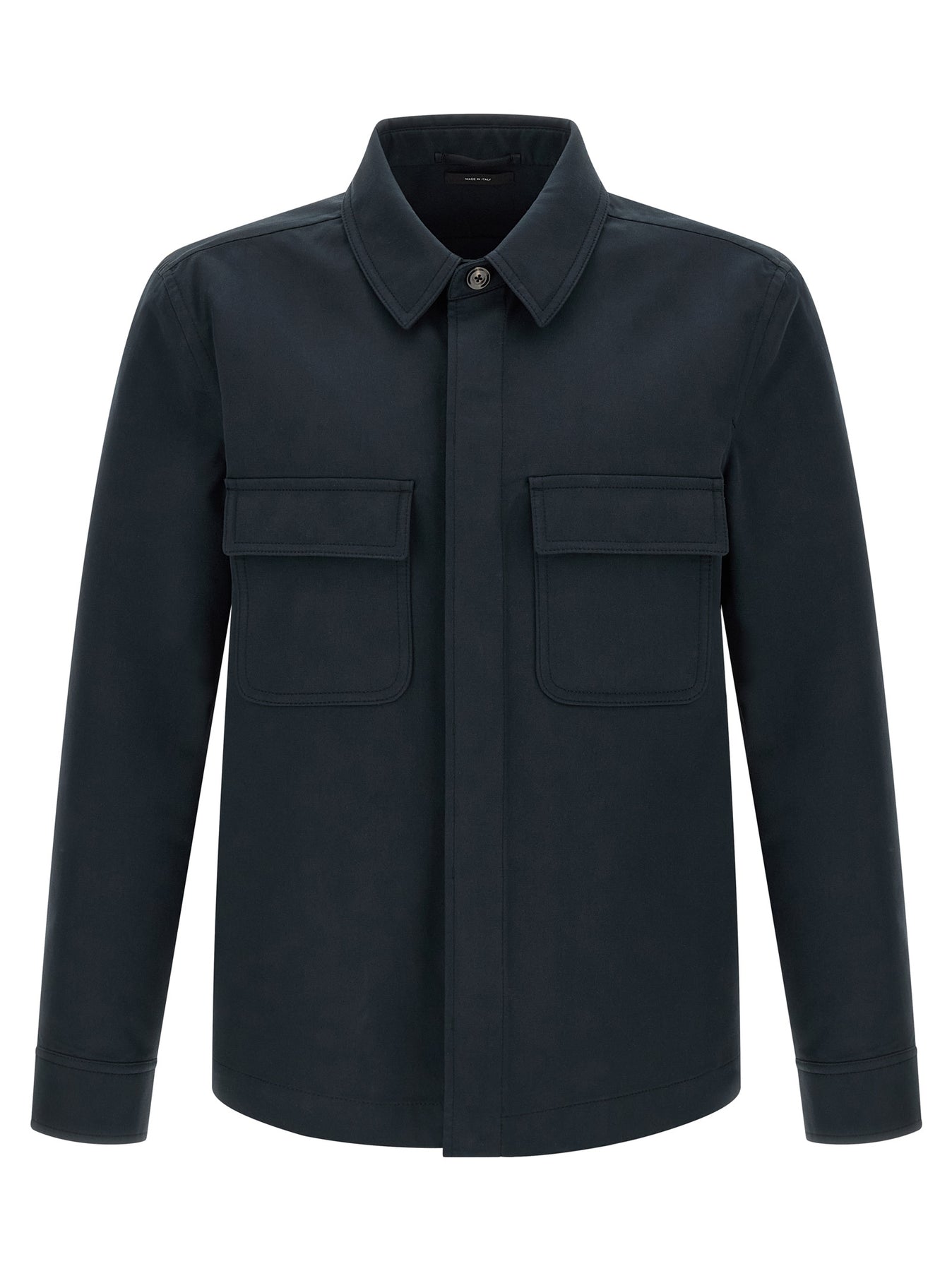 Heavy cotton twill overshirt, front concealed button closure, pockets, long cuffed sleeves, side slits.