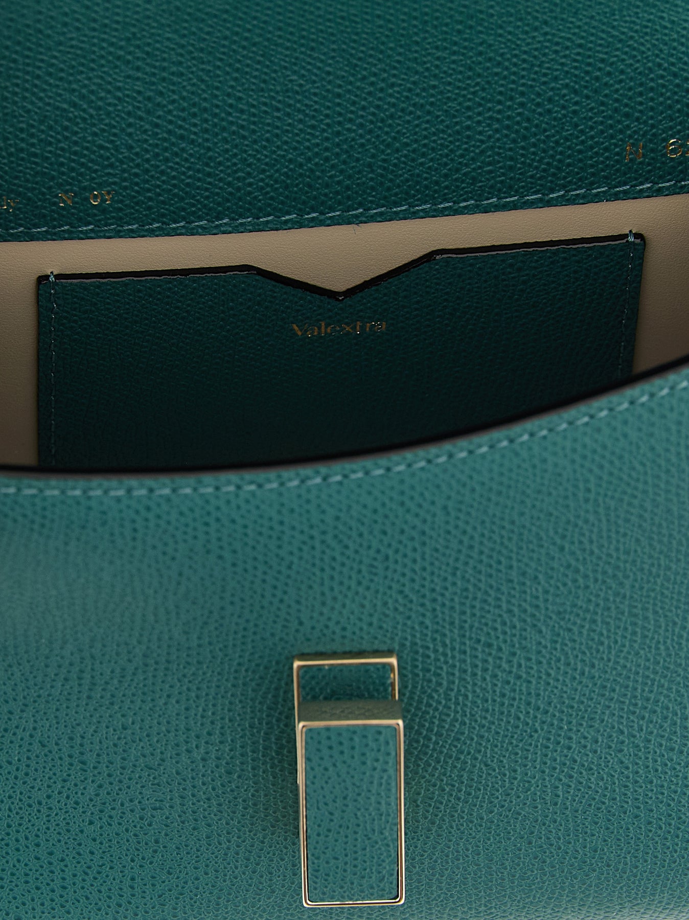 Micro 'Iside' crossbody bag in Millepunte calf leather, Costa Valextra piping, fixed handle, flap turn-lock closure, metal details, adjustable and removable shoulder strap.