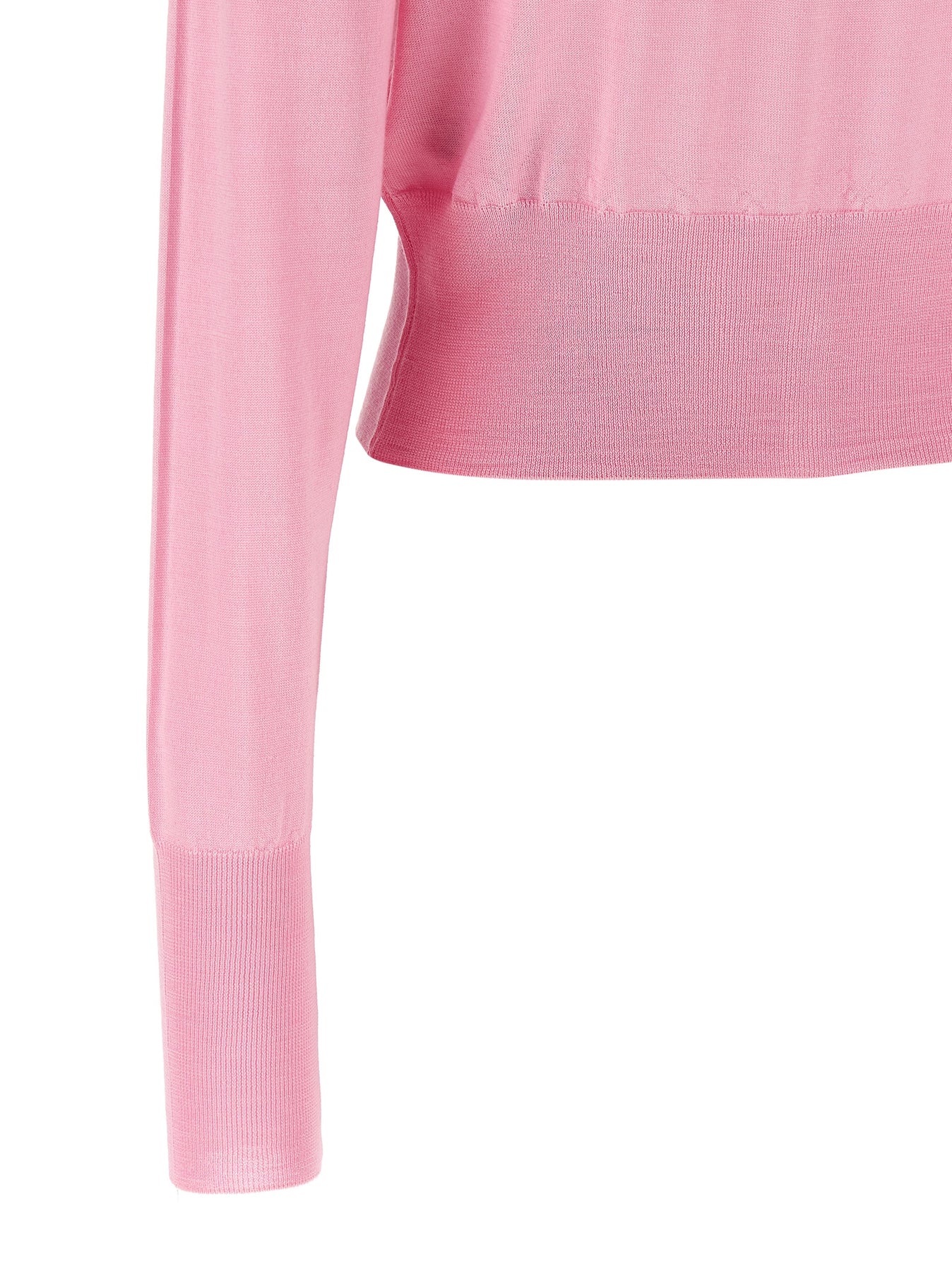 'Bea' cropped wool and silk cardigan with Orb logo embroidery and front button closure, round neckline, long cuffed sleeves.