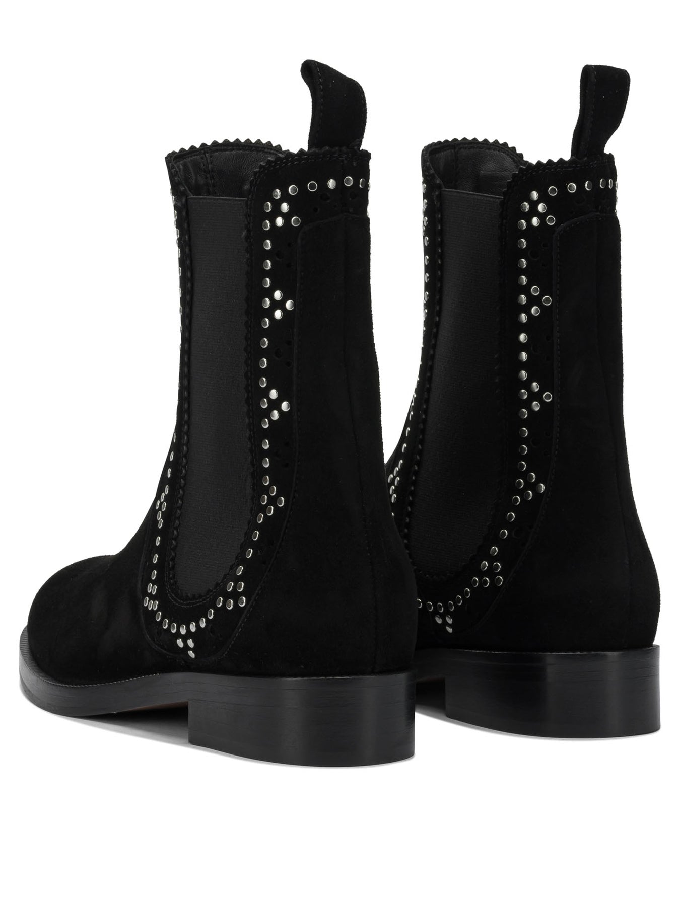 Aquazzura "Skye 20 mm" ankle boots with structured calfskin upper, brush treatment for smooth and shiny surface. Slightly elongated profile, balanced volume, presence of metal studs inserted throughout the upper. Side elements with integrated elastic inserts and leather tongue applied in the front area to aid fit. Flat leather sole and padded insole with embossed Aquazzura logo. || - Calfskin leather upper with glossy brush finish - Application of metal studs on the upper - Elastic inserts on the sides for easy donning - Slip on without closures - Flat leather sole - Padded leather insole - Aquazzura logo printed on the inside