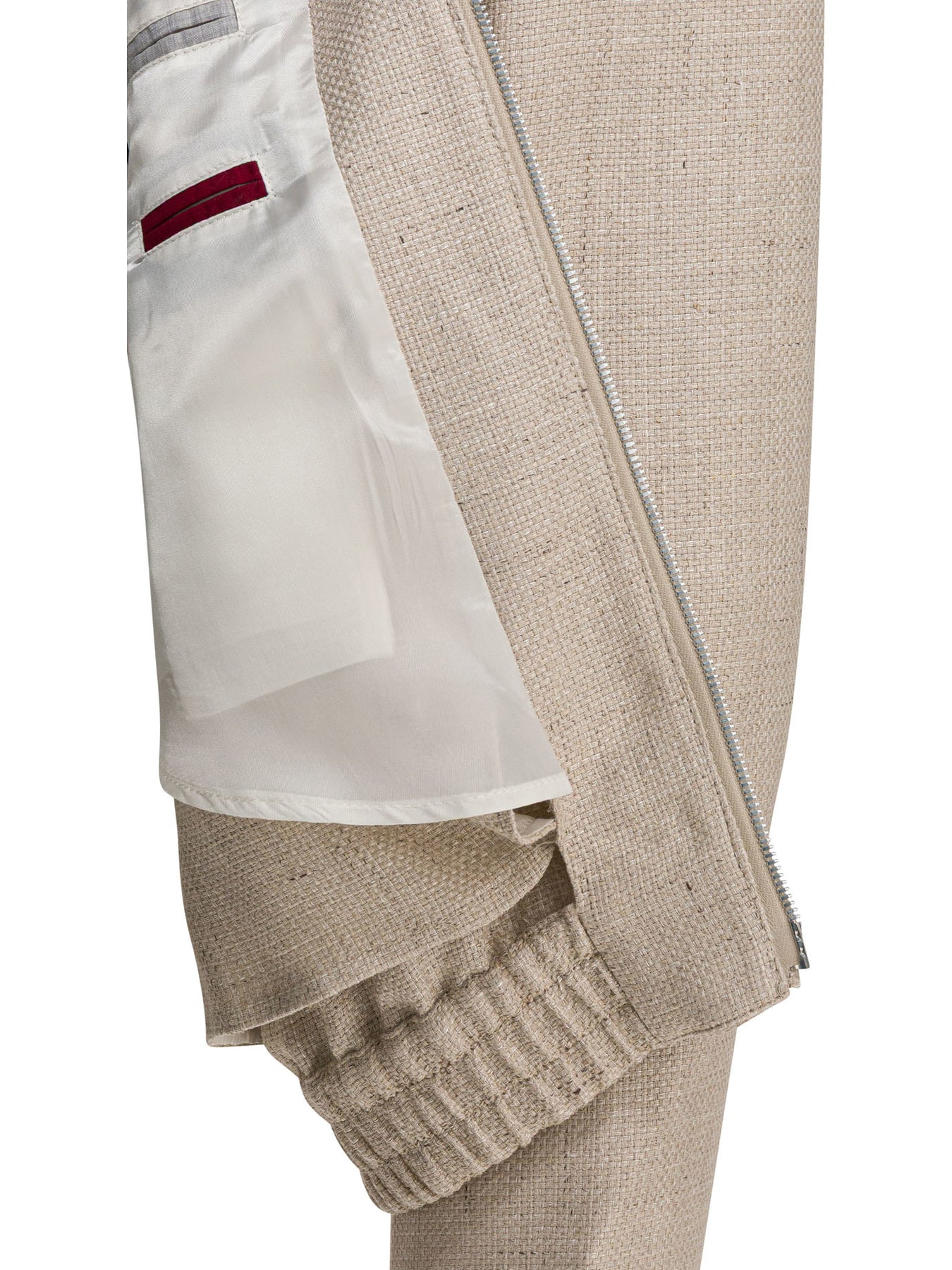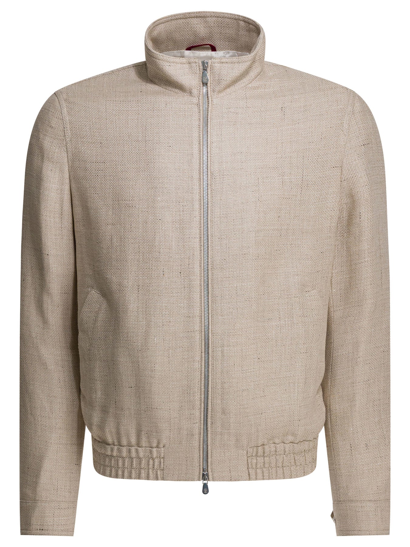 Brunello Cucinelli silk linen-wool hopsack jacket, lightweight construction with untucked structure and half cupro lining. The fabric features an open weave that follows the regular silhouette with defined shoulders and comfortable volumes at the hips. Stand-up collar, double-slider zipper closure, cuffs and low pockets with snap buttons. Hem finished with integrated elastic. Two inside pockets with button closure and pen pocket. || - Open weave with slub effect - Lightweight cupro half lining - Front zipper and double slider closure - Standing collar - Adjustable cuffs with snap buttons - Side pockets with snap button - Bottom with elastic - Two inside pockets and pen pocket - Regular fit