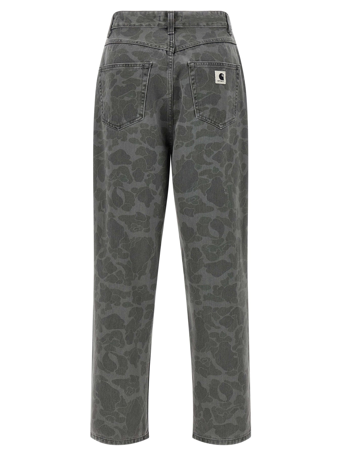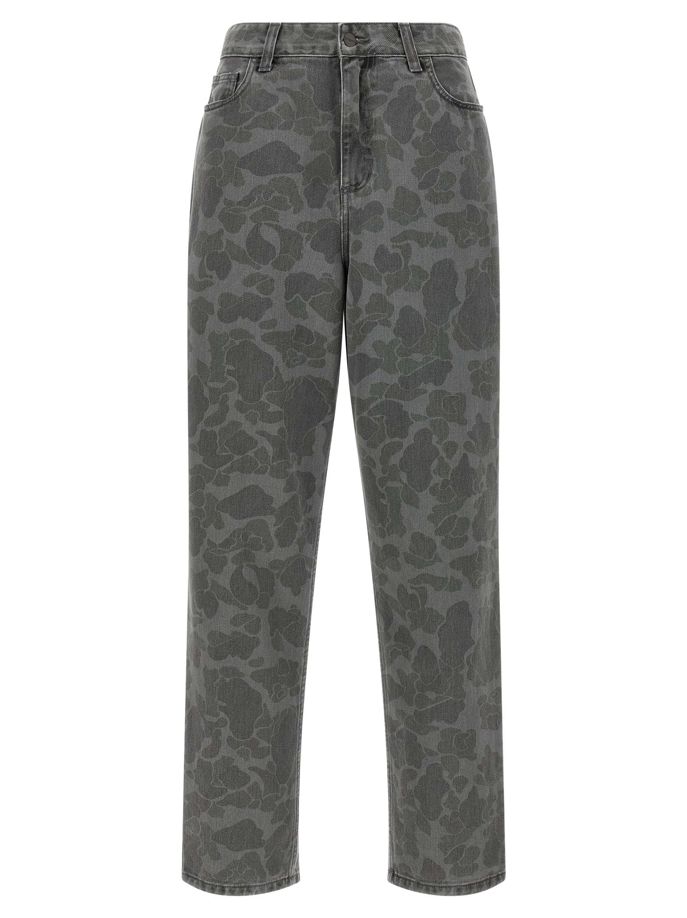 'Duck Orell' heavy cotton denim jeans with tone-on-tone camouflage print and a used effect, high waist, tapered leg, front zip and button closure, five pockets, and back logo patch.