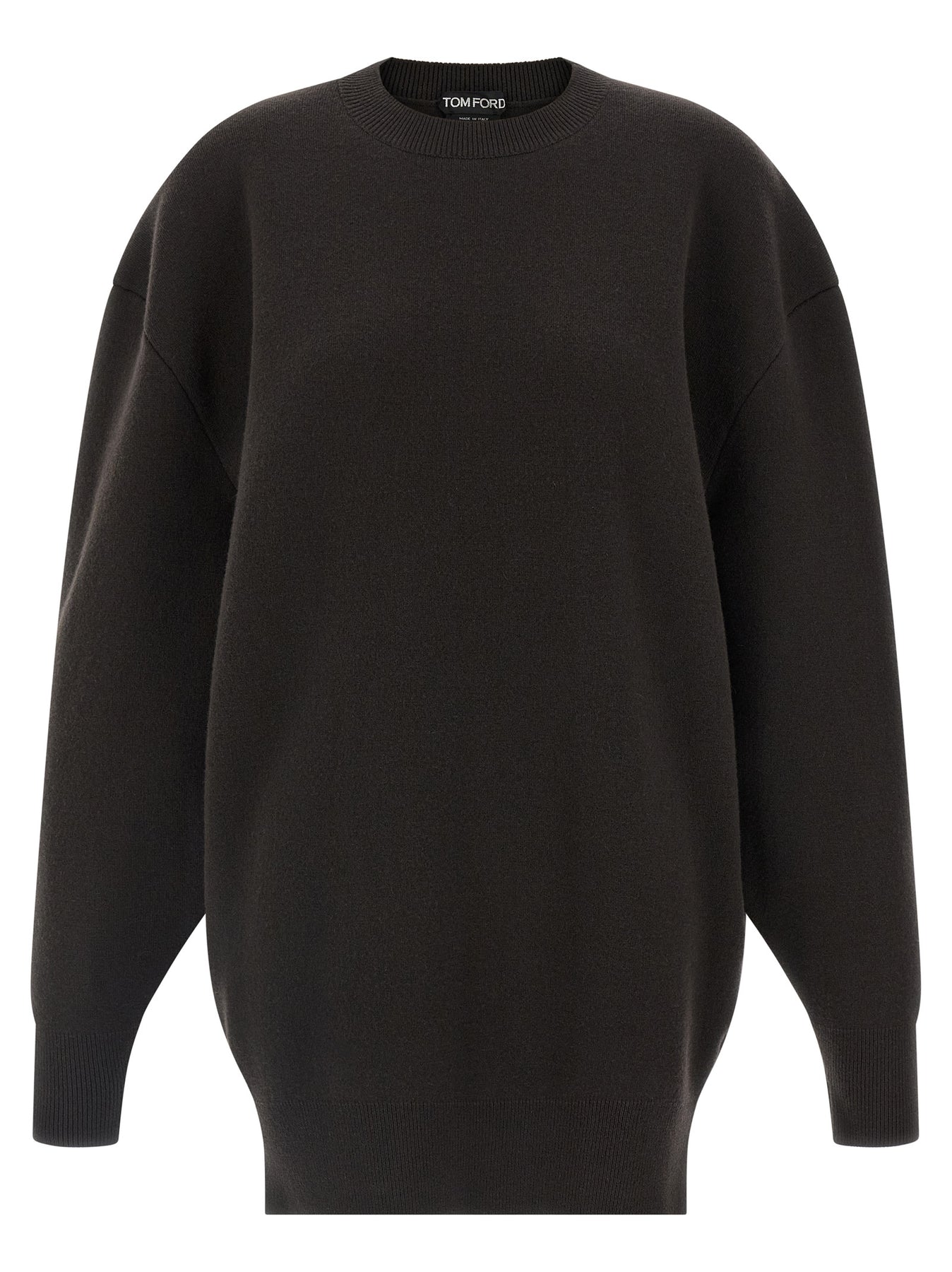 'Sculptural Double Face' double-sided wool and cashmere minidress with pullover model, crew neck, long cuffed sleeves and dropped shoulders.