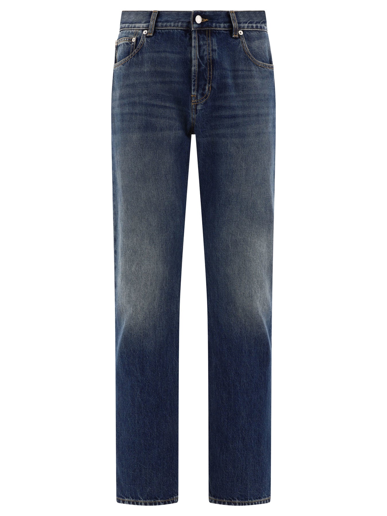 Alexander McQueen jeans with logo detail combine sophisticated design with the superior quality of pure cotton denim. With a contrasting print and logo label on the back, these jeans are the epitome of distinctive modern style, ideal for the man who seeks exclusivity and comfort. || - Belt loops at the waist - Concealed button closure with single visible button - American-style pockets, one patch pocket on the front and one patch pocket on the back - Solid color - Regular fit - Mid-rise || These jeans pair perfectly with a classic white shirt and a pair of leather sneakers for a casual-chic look. For a more refined version, wear them with a blazer jacket and derby shoes.