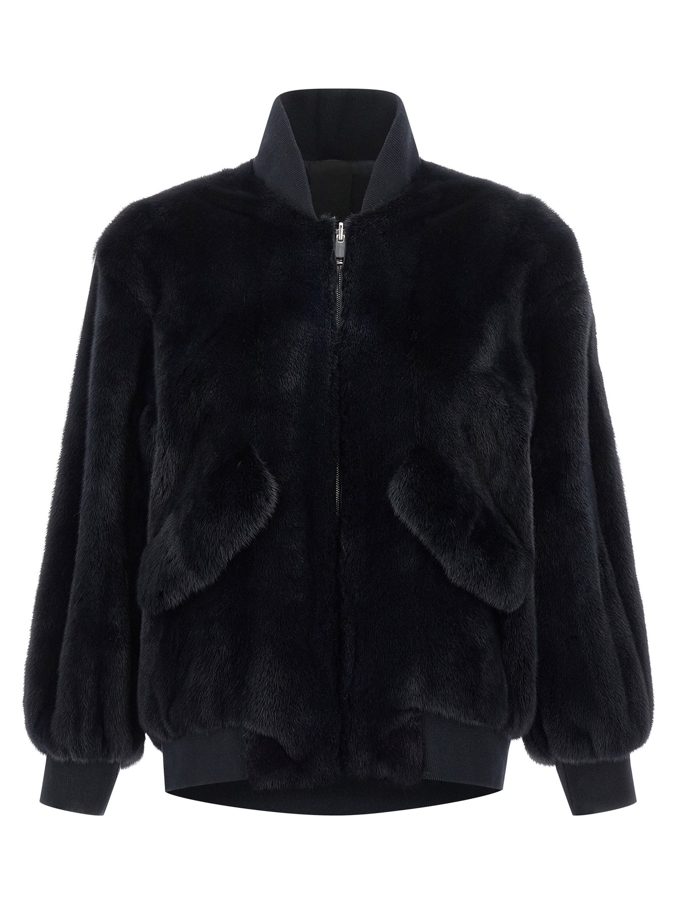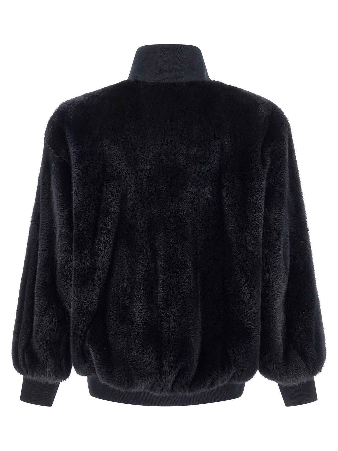 Mink fur bomber jacket, zip closure, side pockets, elastic knit collar and cuffs and hem, long sleeves.