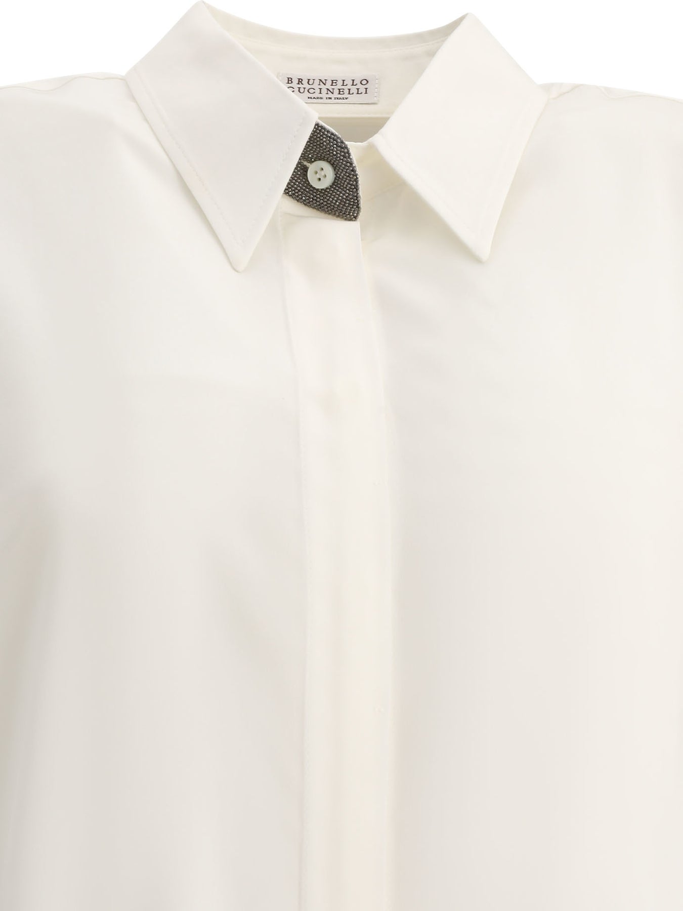 Brunello Cucinelli Precious Buttonhole Crepe de Chine Shirt with Precious Buttonhole features a comfortable fit with a soft structure and wide sleeves. Made of pure silk, the shirt displays a slightly crepey and opaque texture achieved through a workmanship with particularly twisted threads. The classic collar is enhanced by a decoration in thin rows of nickel-free monile. The front closure features a covered flap. || - Solid color - Wide sleeves - Classic collar with nickel-free monile embroidery - Front closure with concealed buttons - Relaxed fit