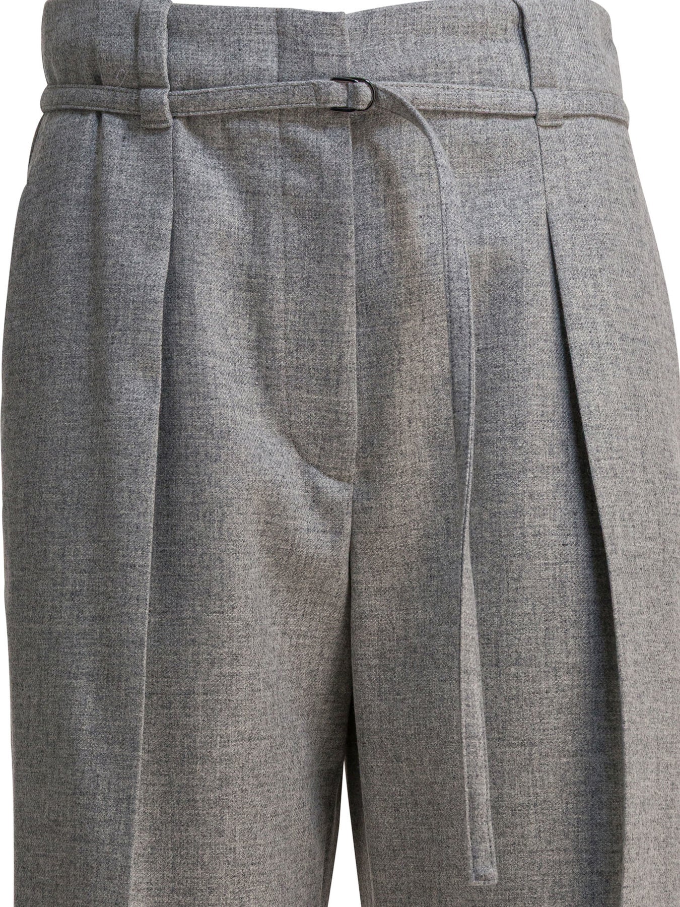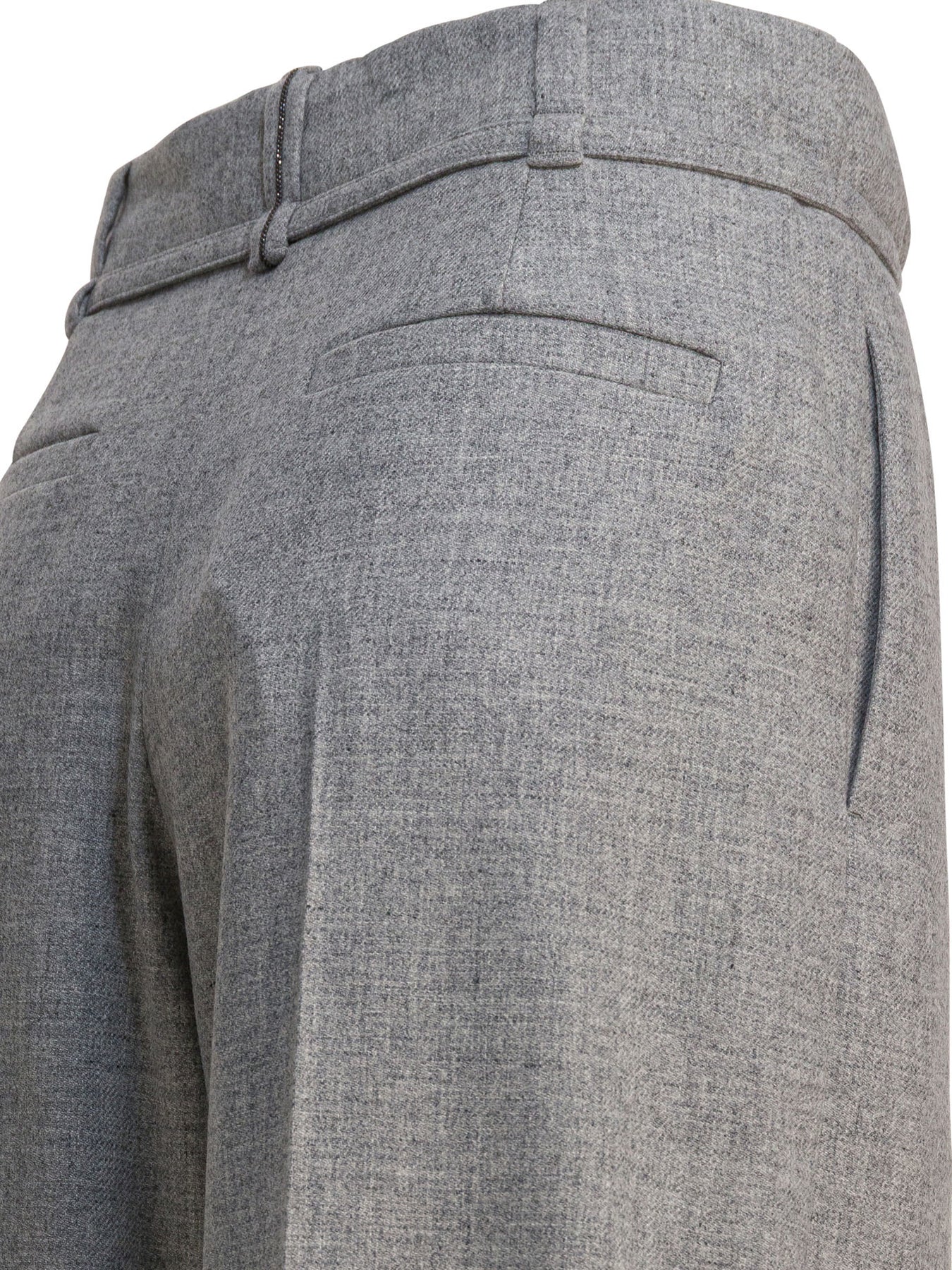 Brunello Cucinelli wide-leg pants featuring wide structure with double front and back darts, ironed crease along the entire leg and straight line. Wool and cashmere main fabric. Zipper and hook-and-eye closure, waist loops and matching fabric belt with 1 cm buckle. Two side welt pockets and two back welt pockets complete the functional construction. || - Solid color - Zipper and hook-and-eye closure - Belt loops - Fabric belt with 1 cm buckle included - Two side welt pockets - Double front and back darts - Pleat present throughout the length of the leg - Two back welt pockets - Composition: 95% wool, 5% cashmere - Wide fit