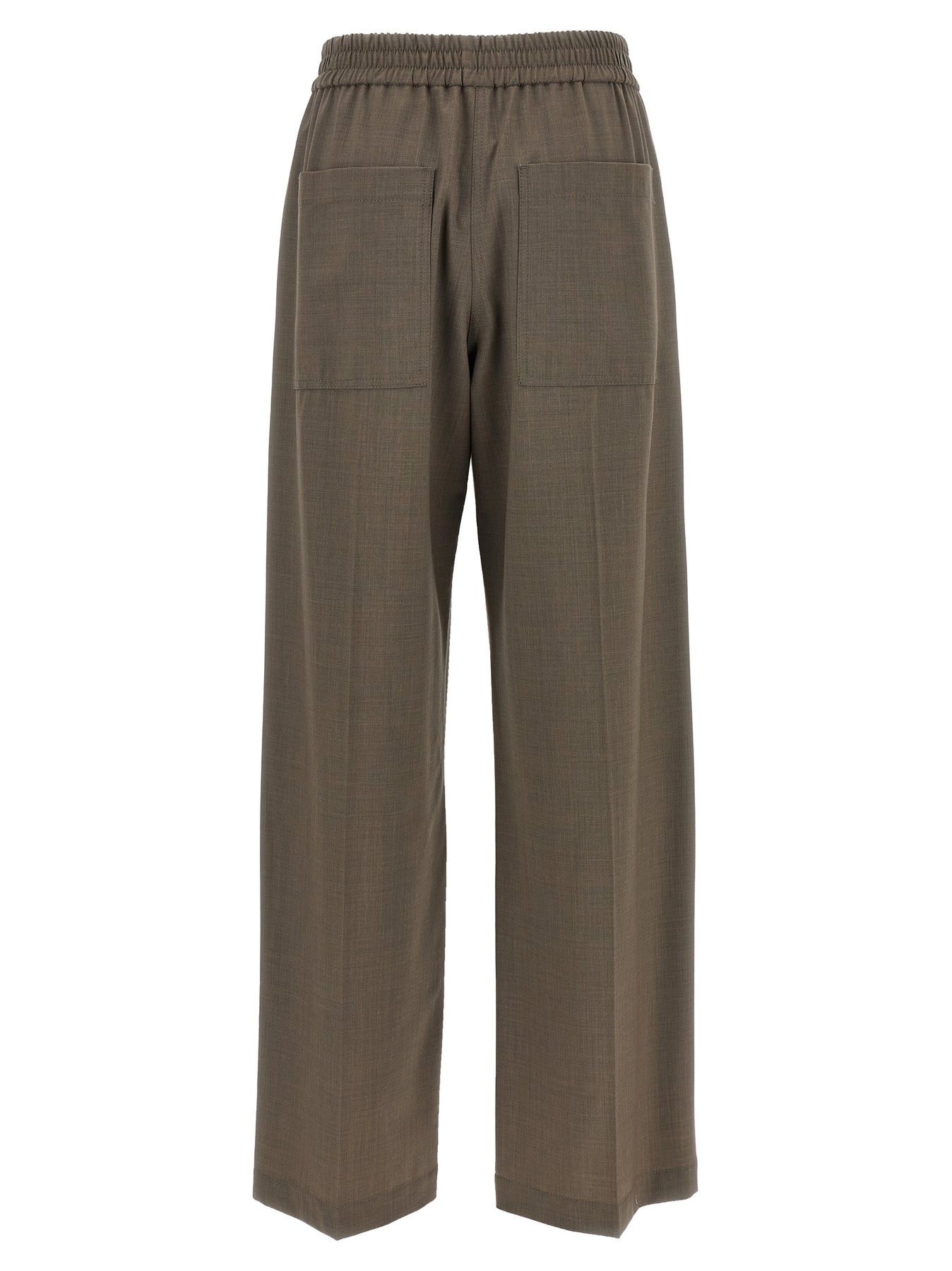 Wool blend trousers, elastic waistband, trompe l'oeil flap, wide and straight leg, stretched pleat, pockets.