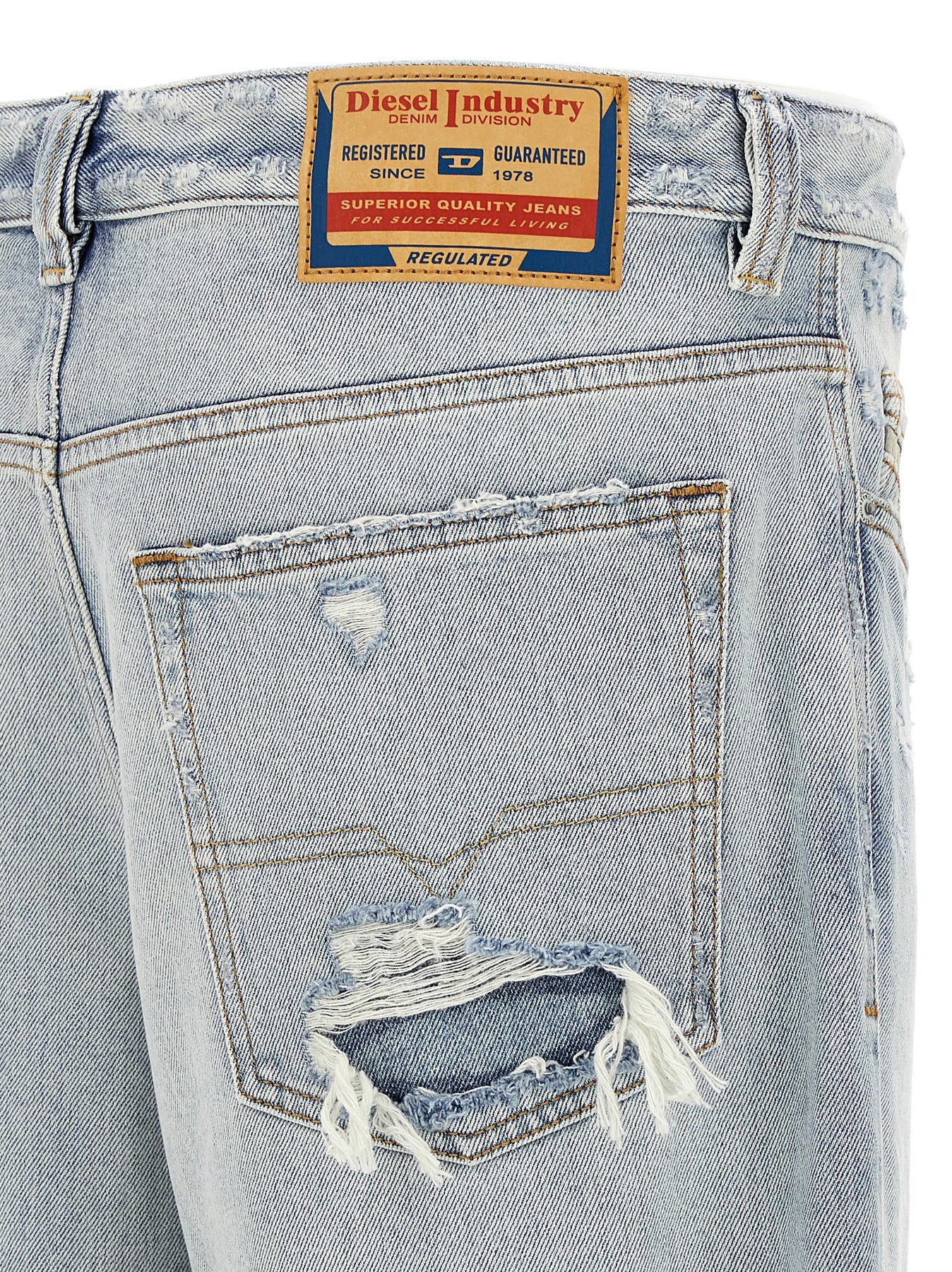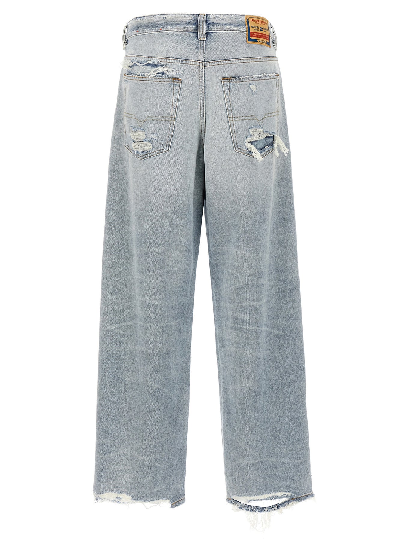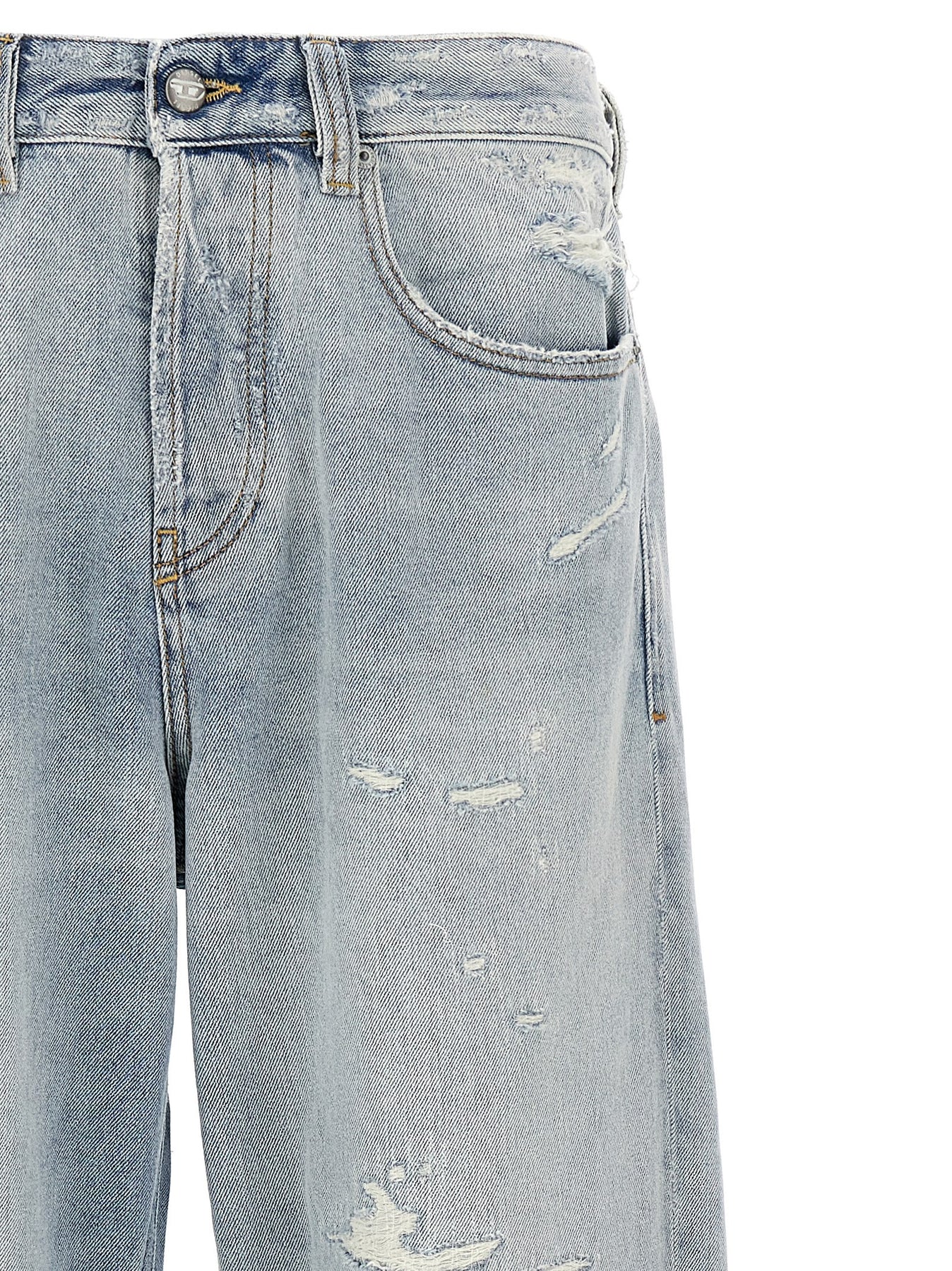 2001 D-Macro' cotton denim jeans with ripped and repaired abrasions, low waist, low crotch and wide leg, five pockets, front button closure, and leather logo label at the back.