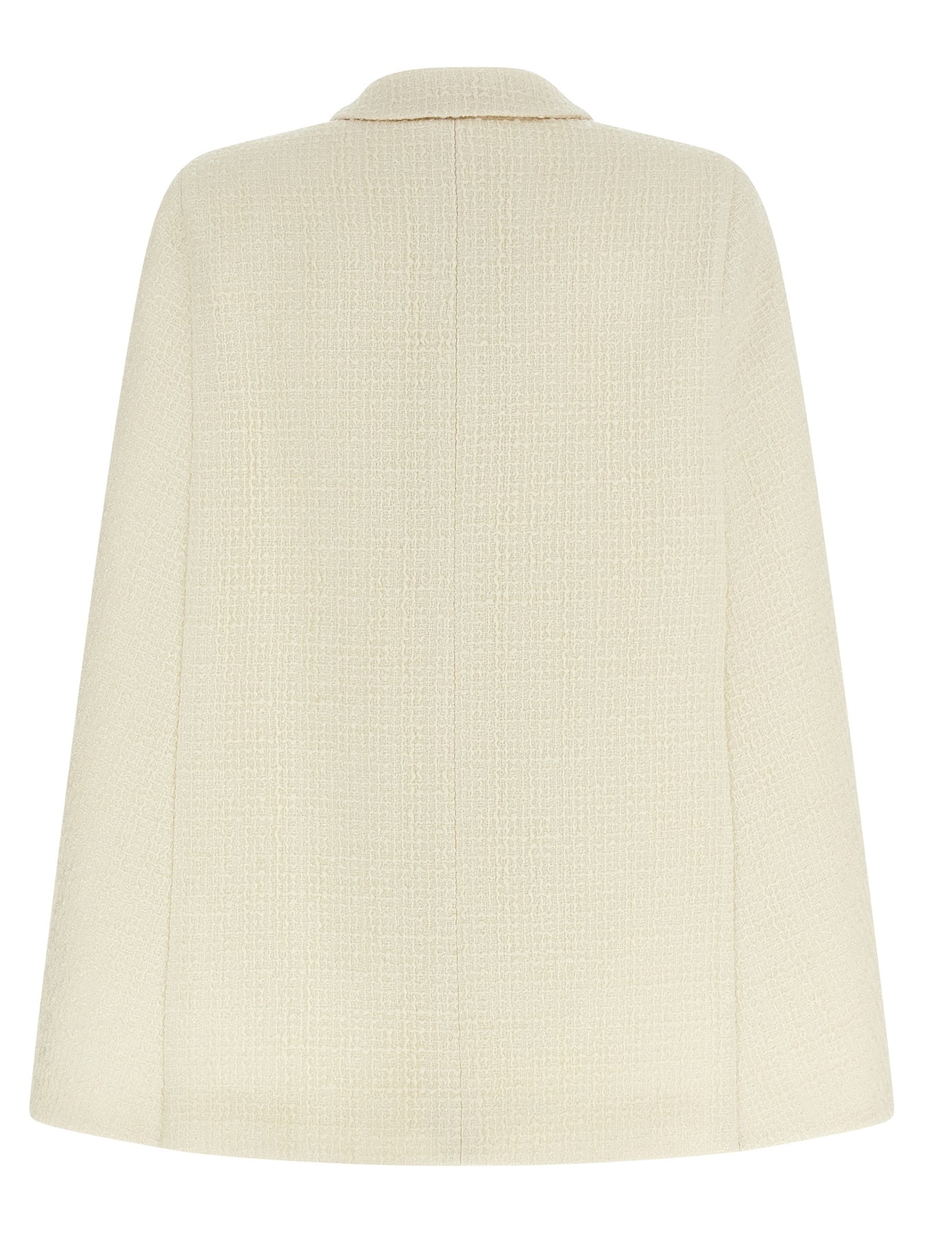 Bouclé wool blazaar with straws consisting of a central waistcoat, double-breasted model with front button closure, peak lapels, breast pocket, flap pockets, sleeveless, back slit and a hood upper part with structured shoulder strap.