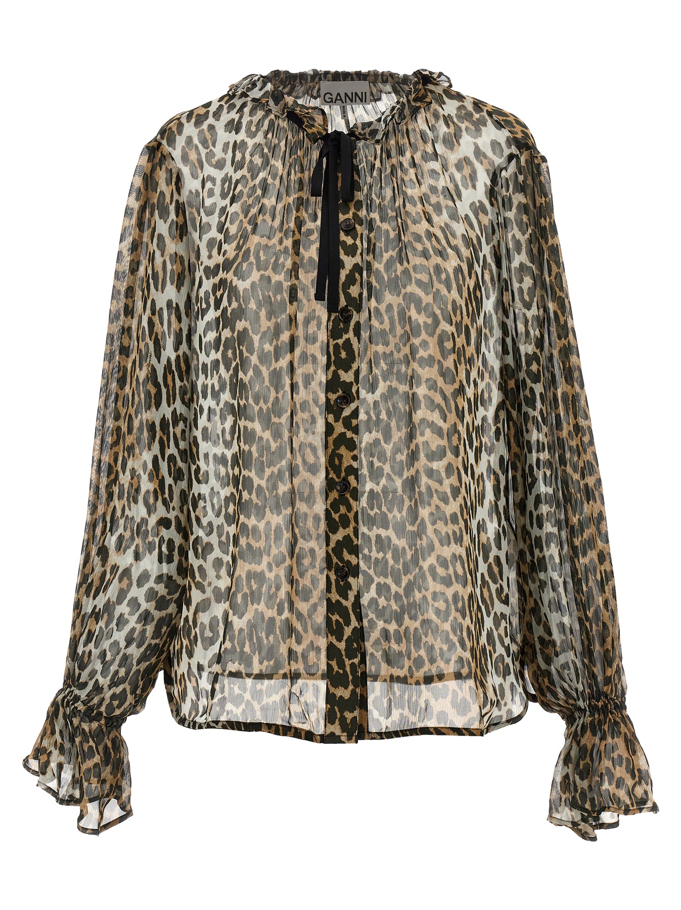 'Leopard Print Chiffon Tie String' shirt in light viscose semi-transparent leopard print, crew neck with ruffles and grosgrain lacing, front button closure, long sleeves with elastic cuffs.