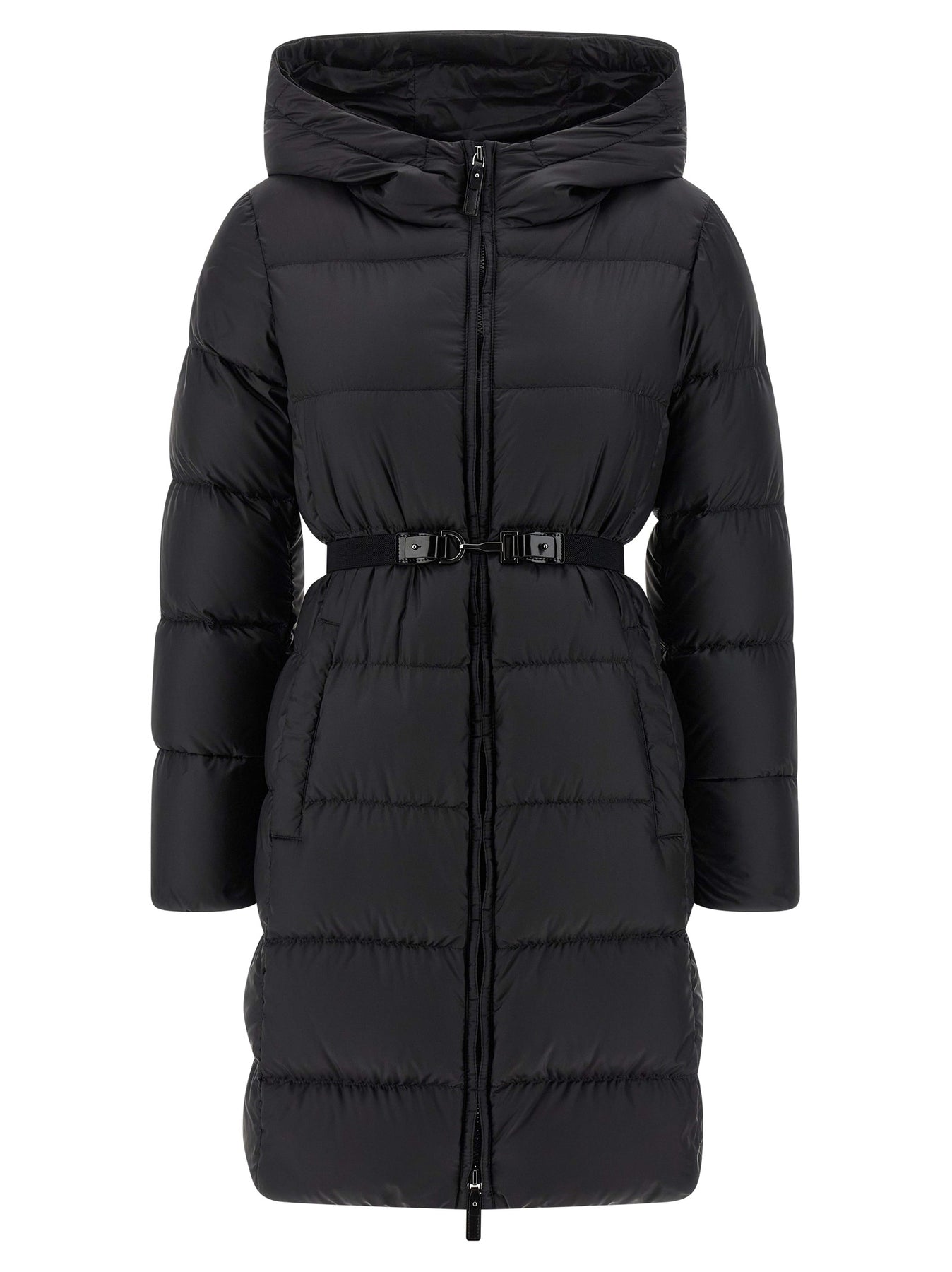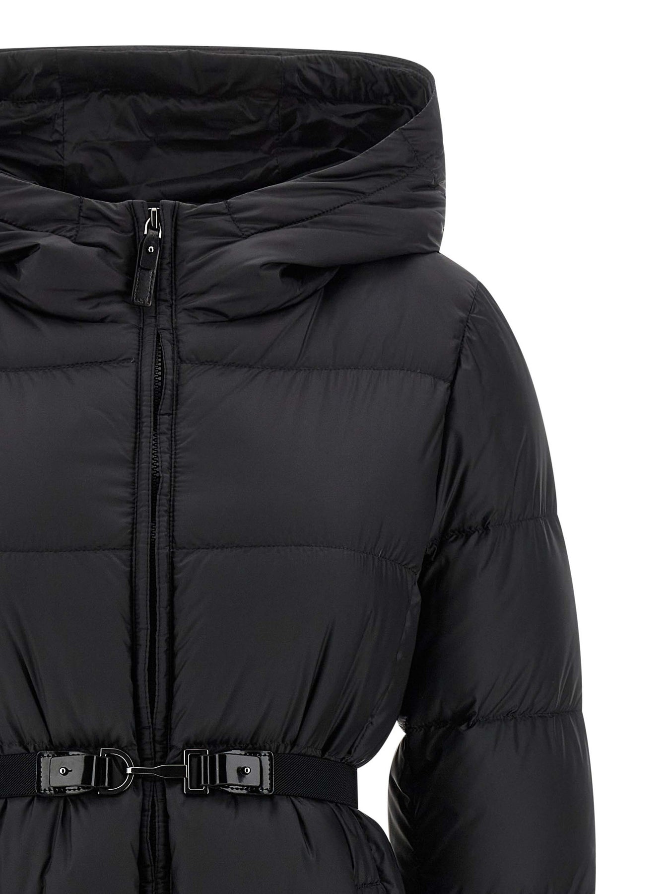 'Seipar' down jacket in waterproof technical canvas quilted with horizontal stripes and goose down padding, hood, front zip closure, pockets, long sleeves, elastic tape belt and removable snap hook buckle.