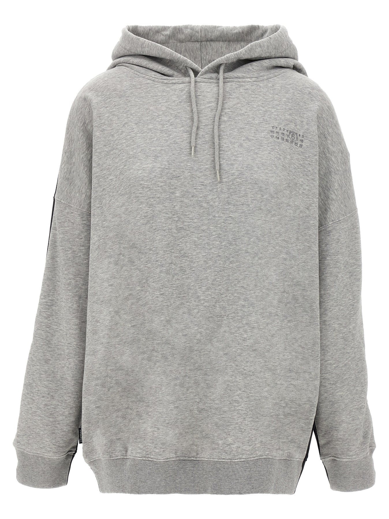'Double Front' brushed cotton sweatshirt with open hood, long sleeves with cuffs and 'White stitch line' on the shoulder consisting of a solid color part with tone-on-tone print and front zip closure, pockets and a melange part with tone-on-tone 'Numeric signature MM6' embroidery.