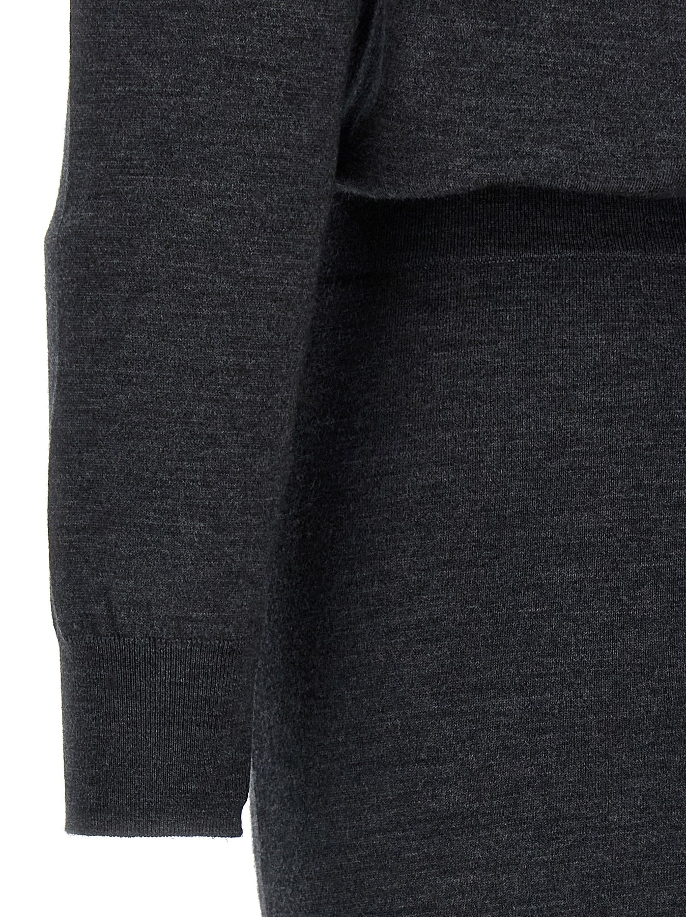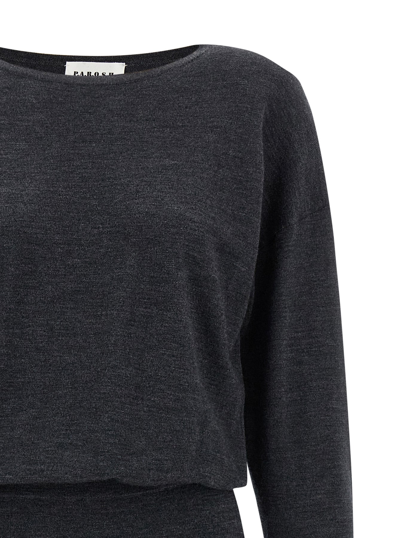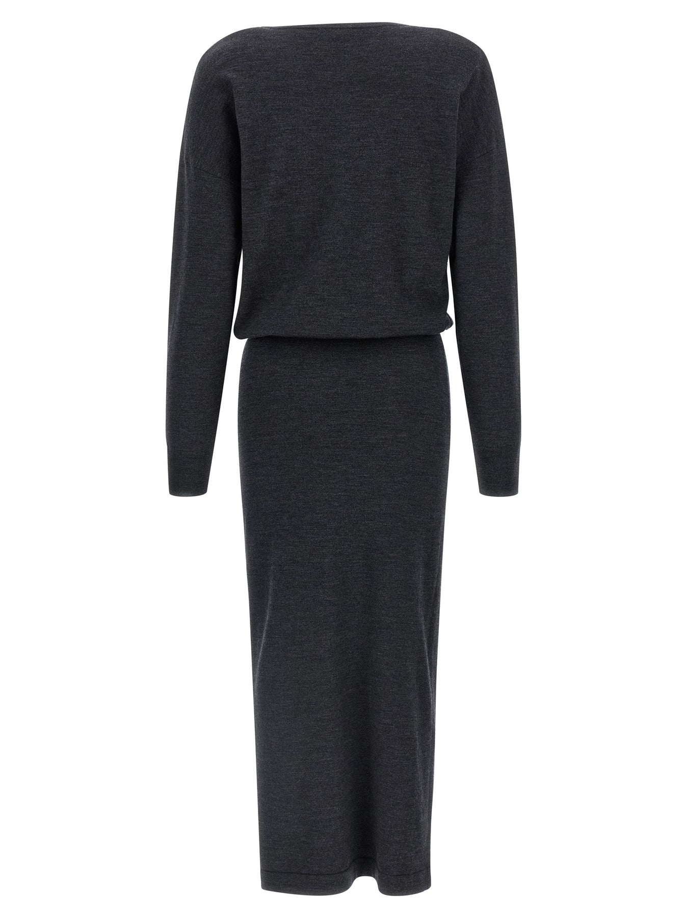 'Lime25' wool and cashmere midi dress with round neckline, elastic waistband that allows you to smudge the upper part, removable padded shoulders, long bat sleeves with cuffs, side split.