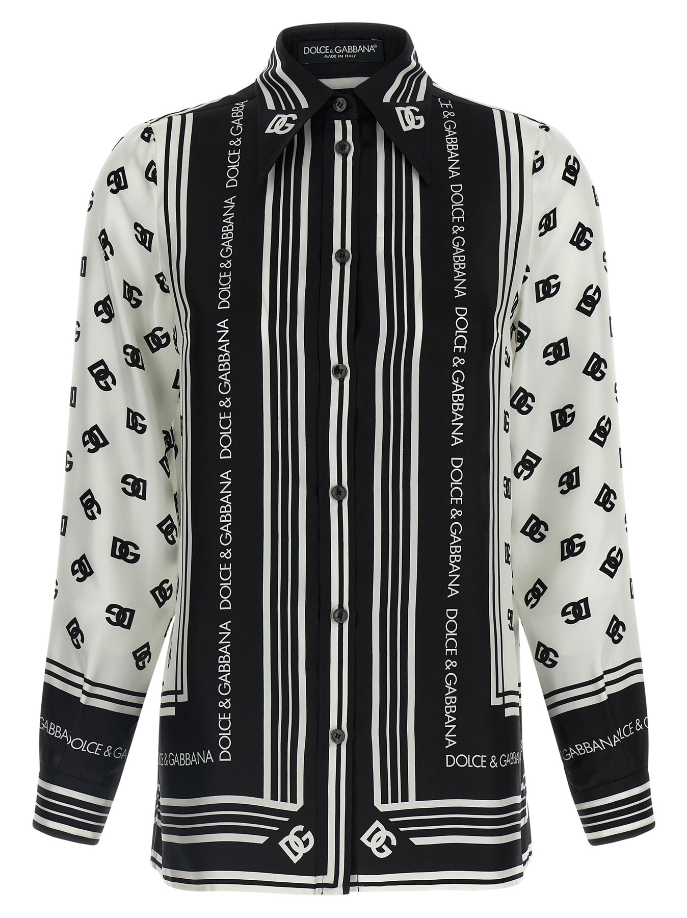 All-over DG print silk twill shirt, pointed collar, front button closure, long cuffed sleeves, side slits.