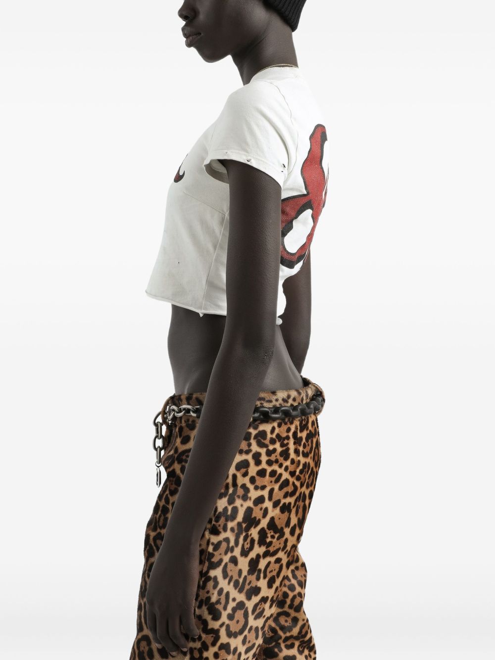 off-white doll print short sleeves cropped hem distressed edges round neck