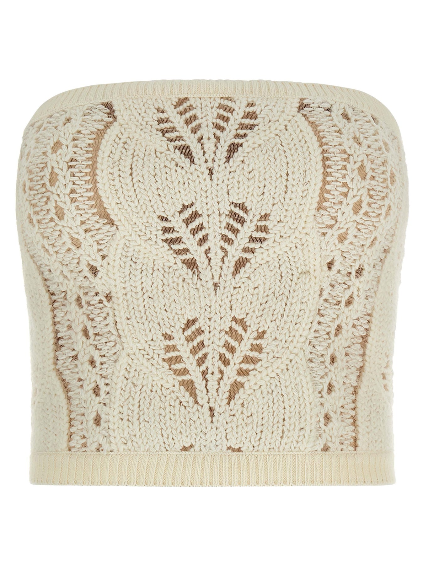Tricot wool top, tulle bustier lining with preformed cup and splints, off-the-shoulder bandeau model, back hook closure.