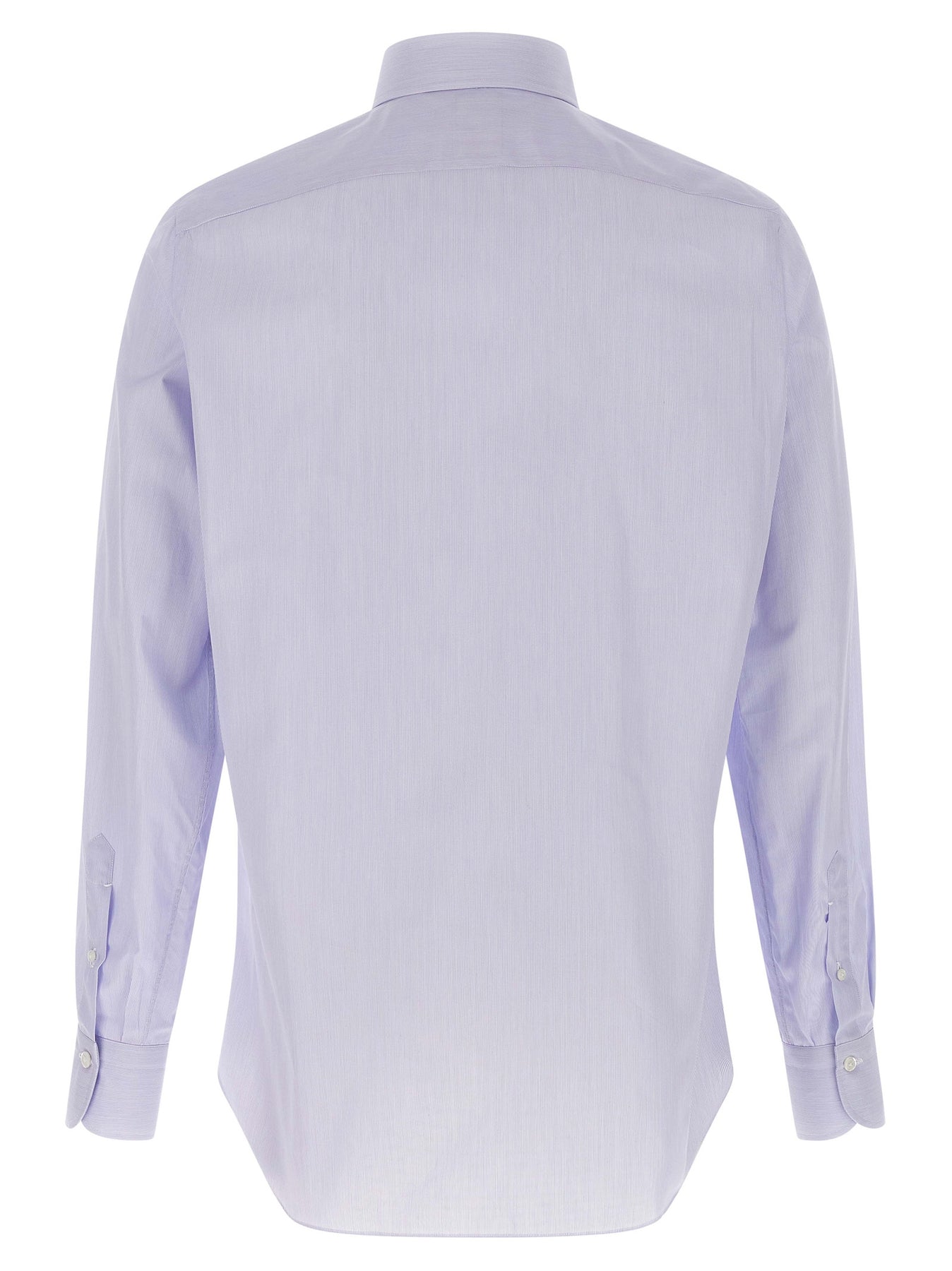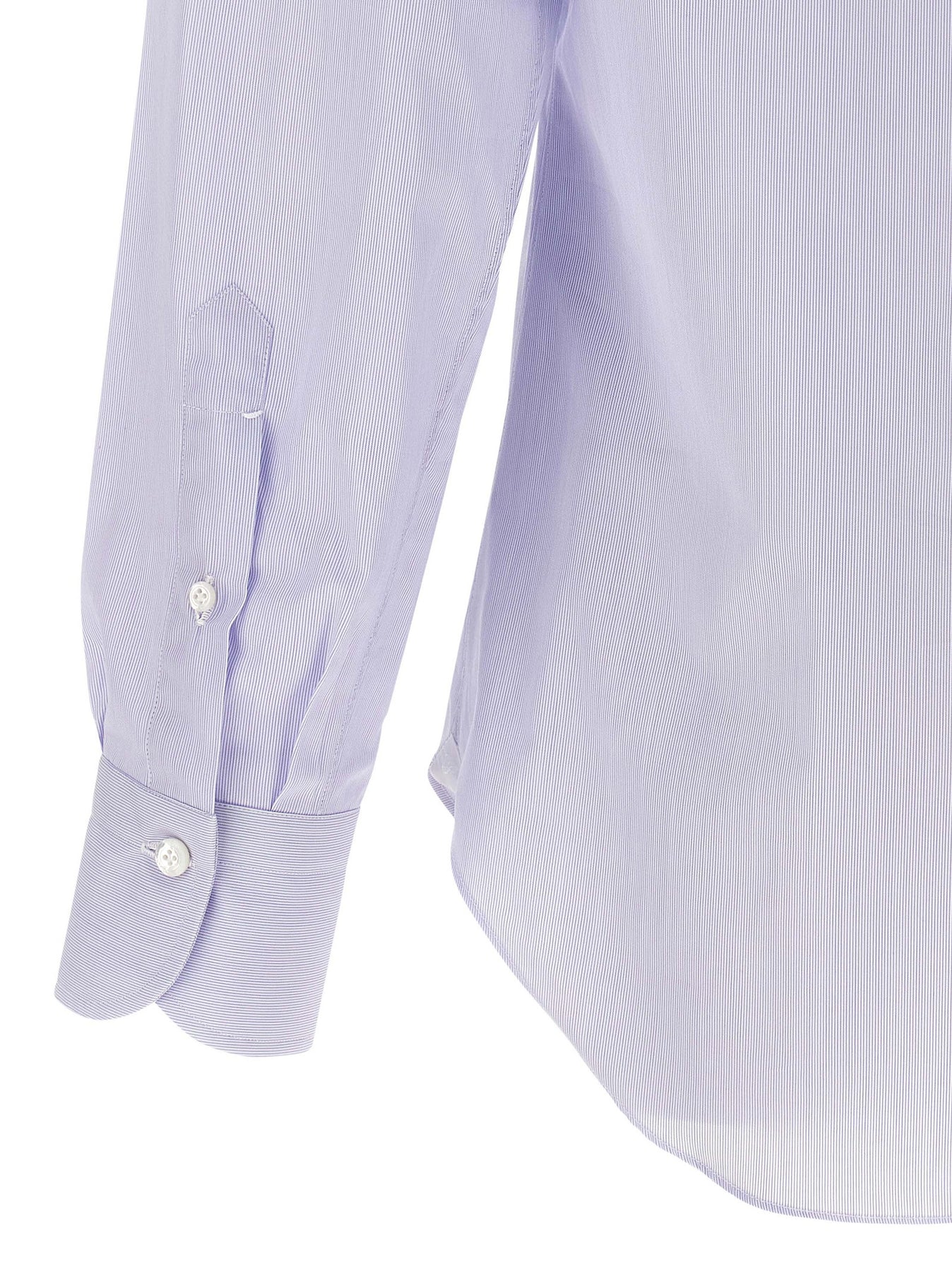Micro striped cotton poplin Luigi shirt, front button closure, long cuffed sleeves, and contrasting satin logo detail on the side slits.