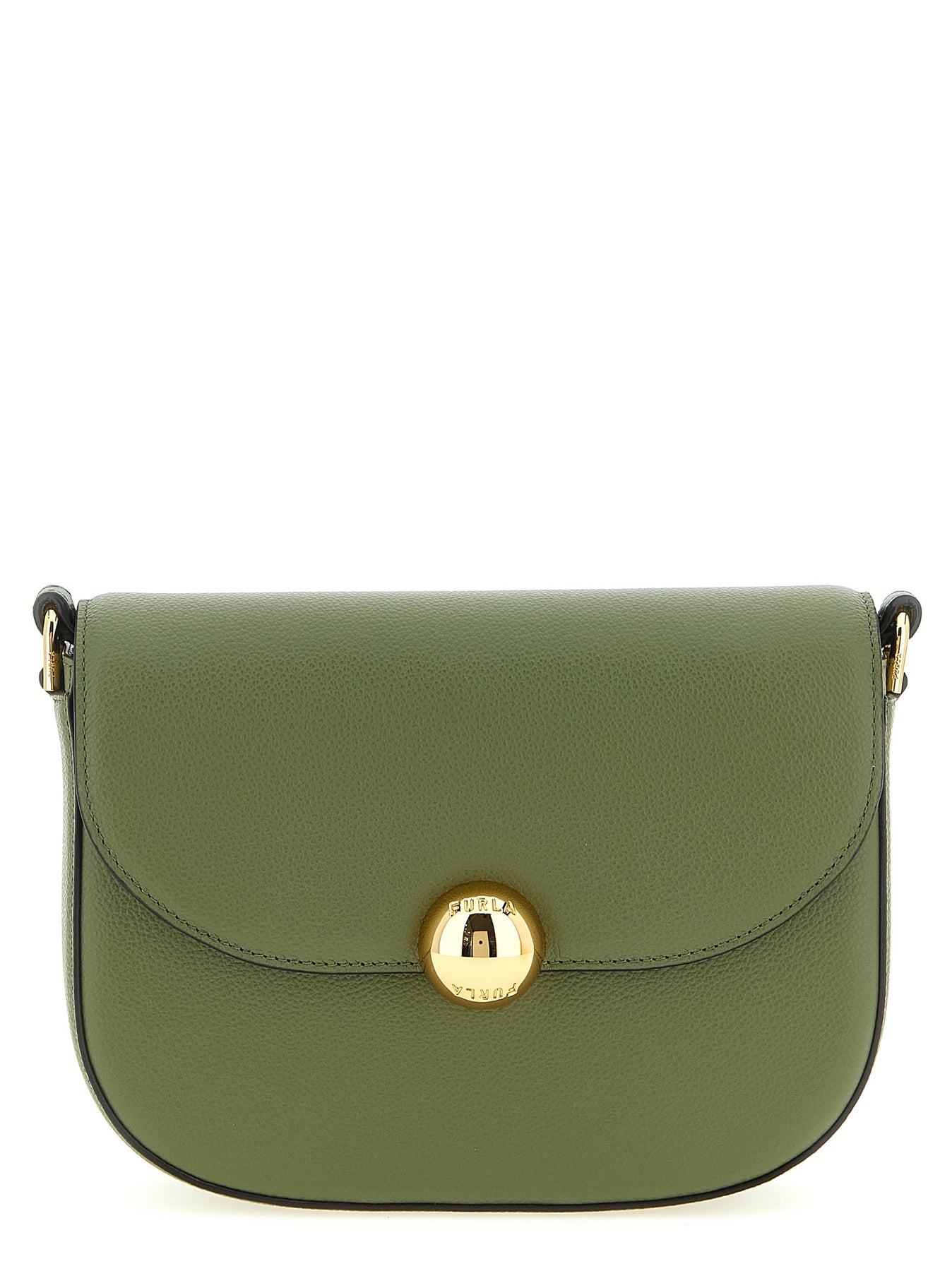 Small fine leather 'Furla Moonlight' crossbody bag with a light hammered finish, magnetic flap closure with iconic metal 'Sfera' logo on the front, embossed logo on the back, and adjustable shoulder strap.