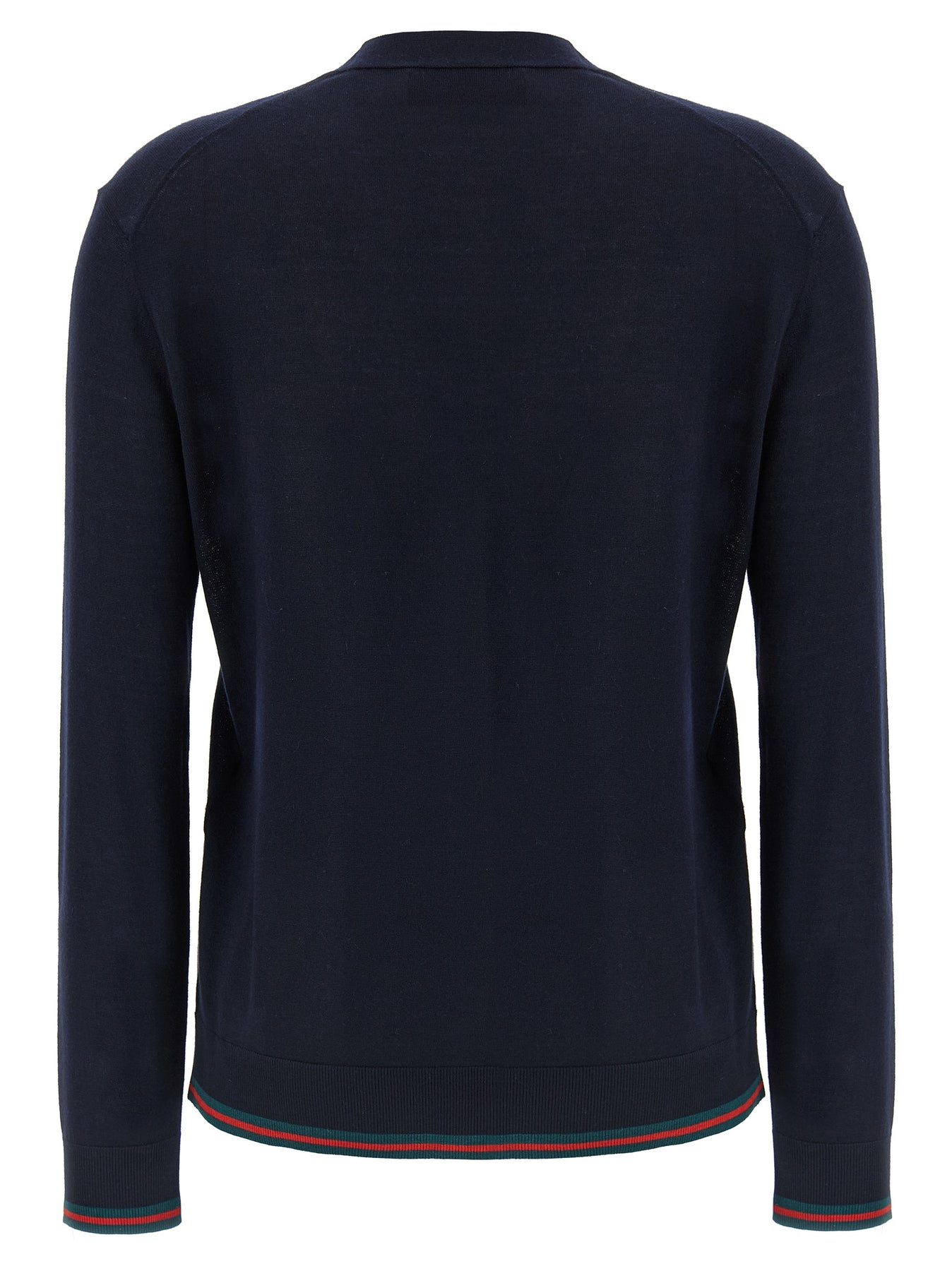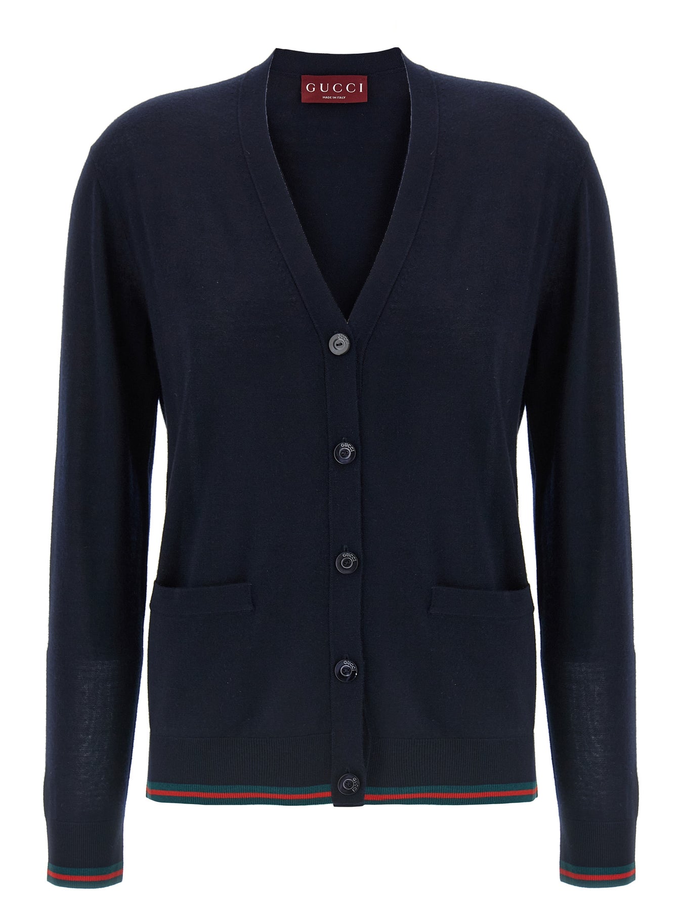 Cardigan in shaved silk and extra fine cashmere with Web detail, V-neck, front button closure, pockets, long sleeves with cuffs and dropped shoulder.