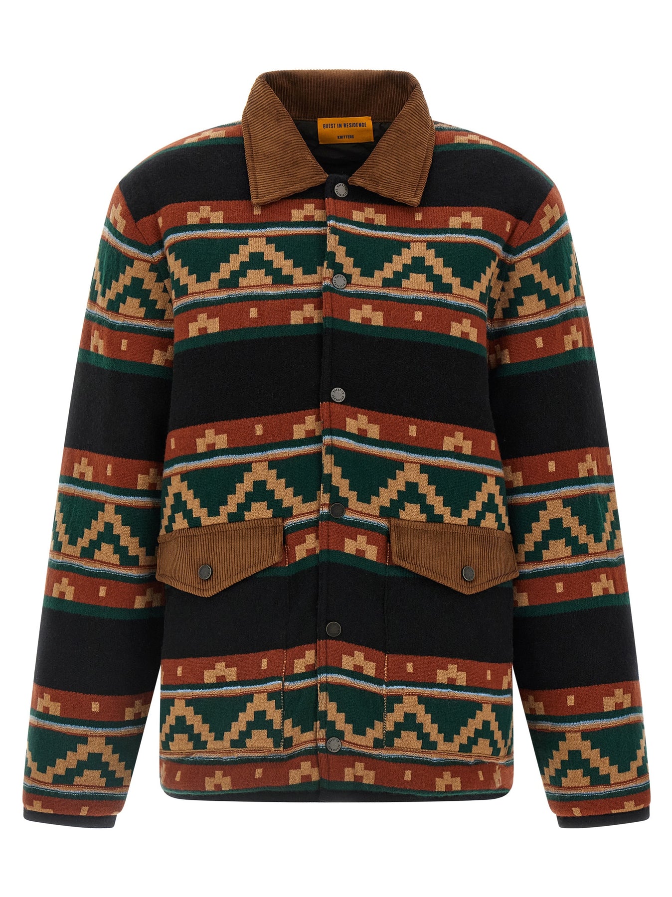 'Western Industry' mercerized wool and medium-weight cashmere jacket with jacquard pattern, slightly padded quilted nylon lining, corduroy collar and flap, front snap button closure, pockets, long cuffed sleeves.