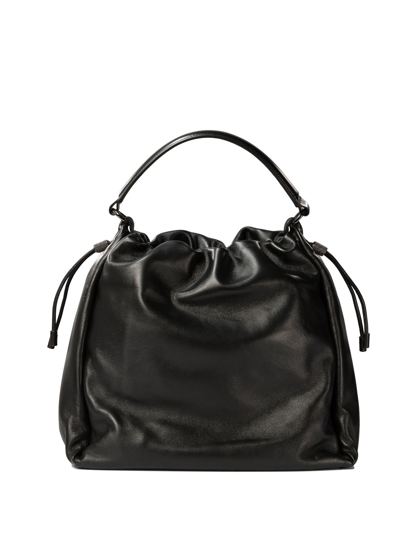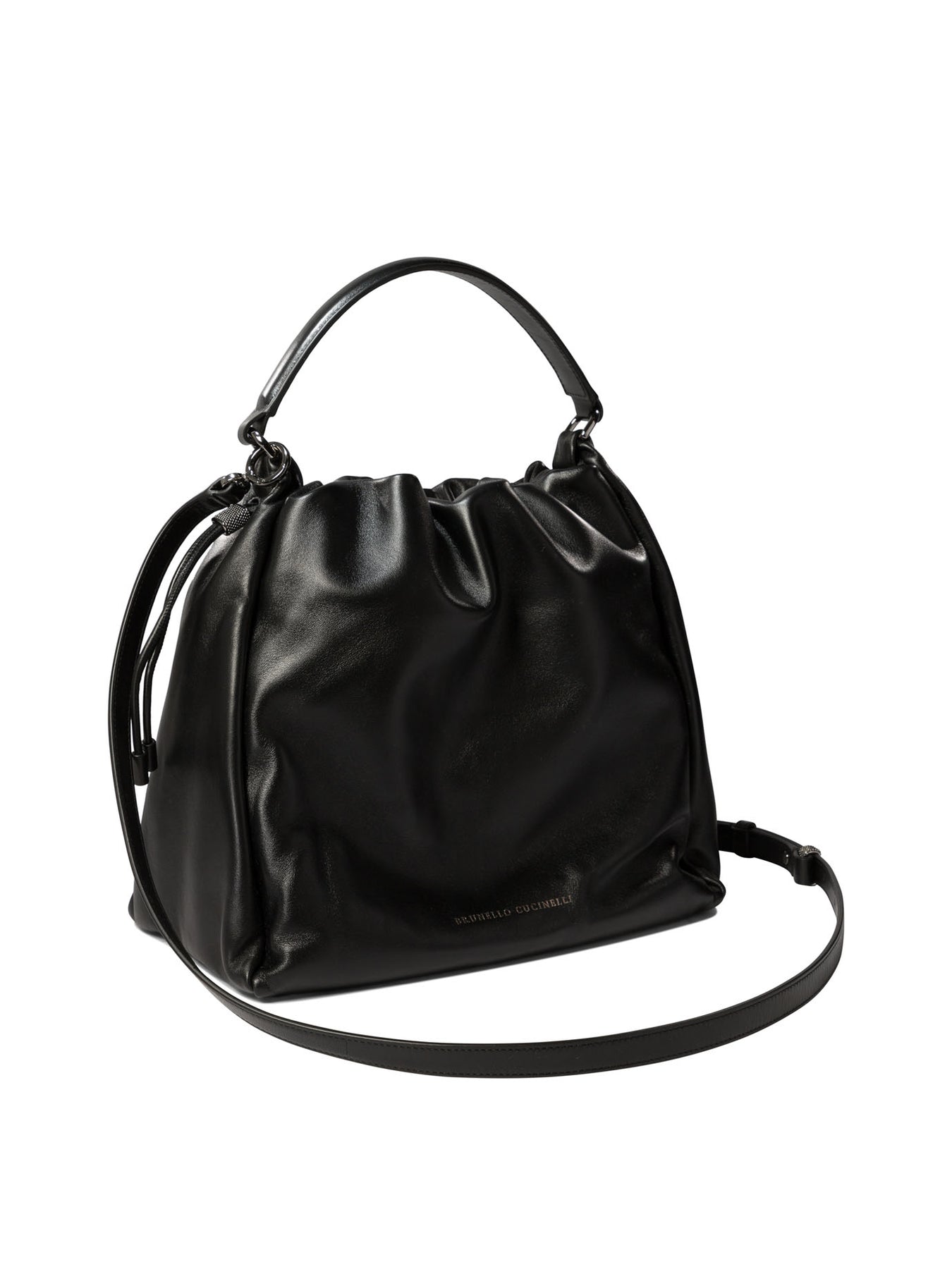 Brunello Cucinelli "Bucket Mellow" handbag made of Soft leather with a bucket silhouette and soft structure. The essential construction features a drawstring closure that gathers the upper volumes and generates a slightly curled effect. The structured handle complements the adjustable and removable shoulder strap, while the interior features a leather lining and a zippered pocket. || - Drawstring closure - Top handle - Adjustable and removable shoulder strap - Leather lining - Inside pocket with zipper closure - Jewel detail