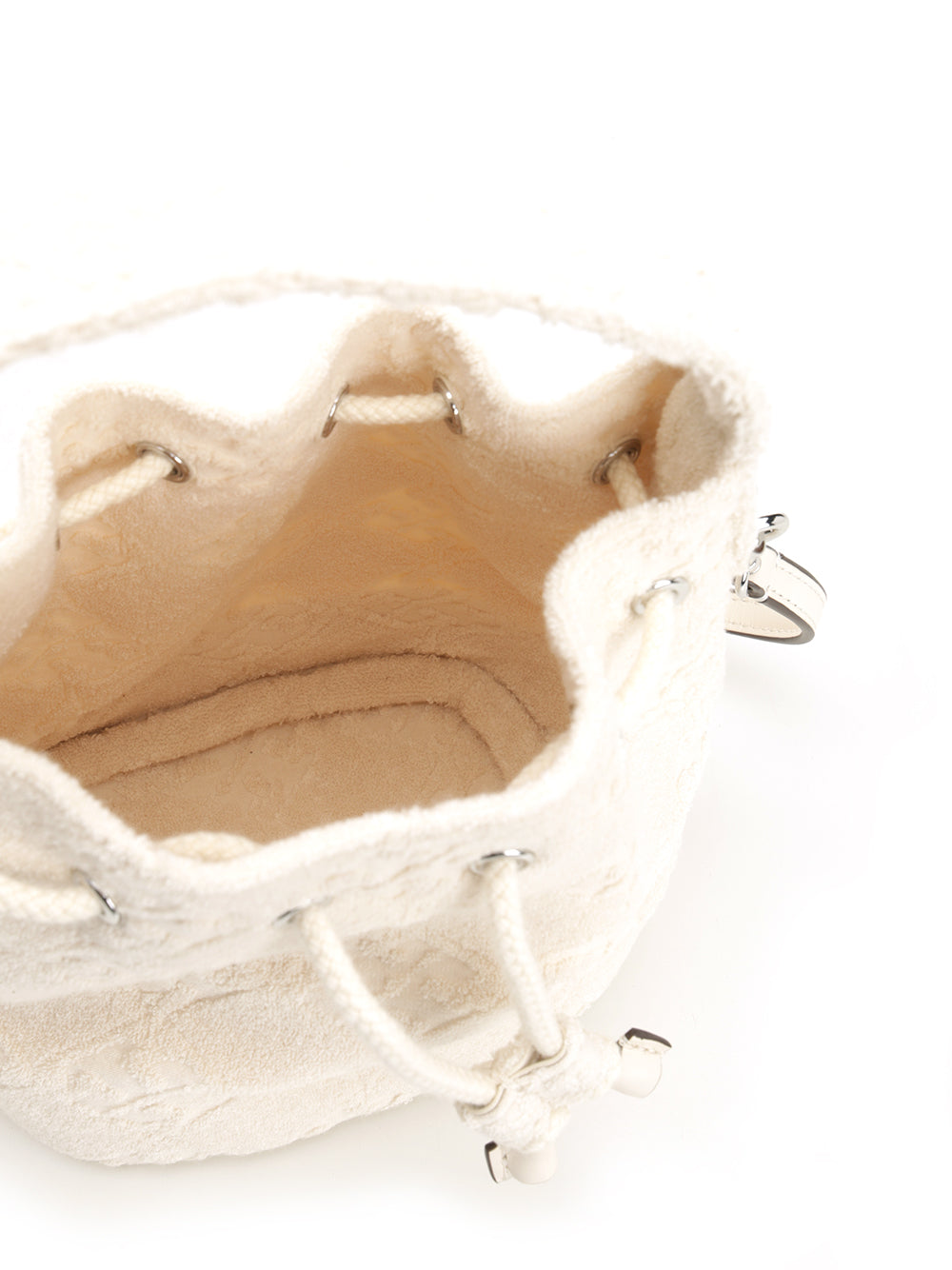 Tory Burch's "T Monogram" mini bucket bag in tightly woven terry cloth, finished in premium leather, features an adjustable top handle and a removable zip pouch.