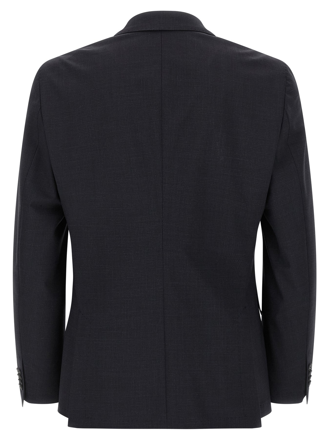 Performance line P-Huge 4-way stretch wrinkle resistant virgin wool blend Performance dress consisting of single-breasted blazer with front button closure, mirror lapels, breast pocket, flap pockets, lining, two inner pockets, cuffs with opening buttonholes, back slits and trousers with ironed crease, front pockets 'americane', back welt pockets, zip hook and front button closure, lining.