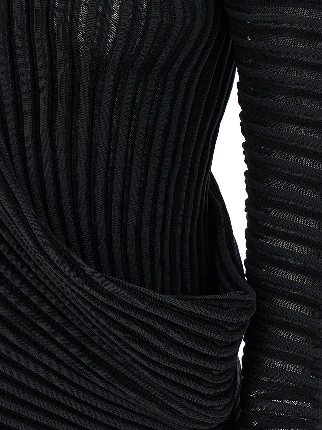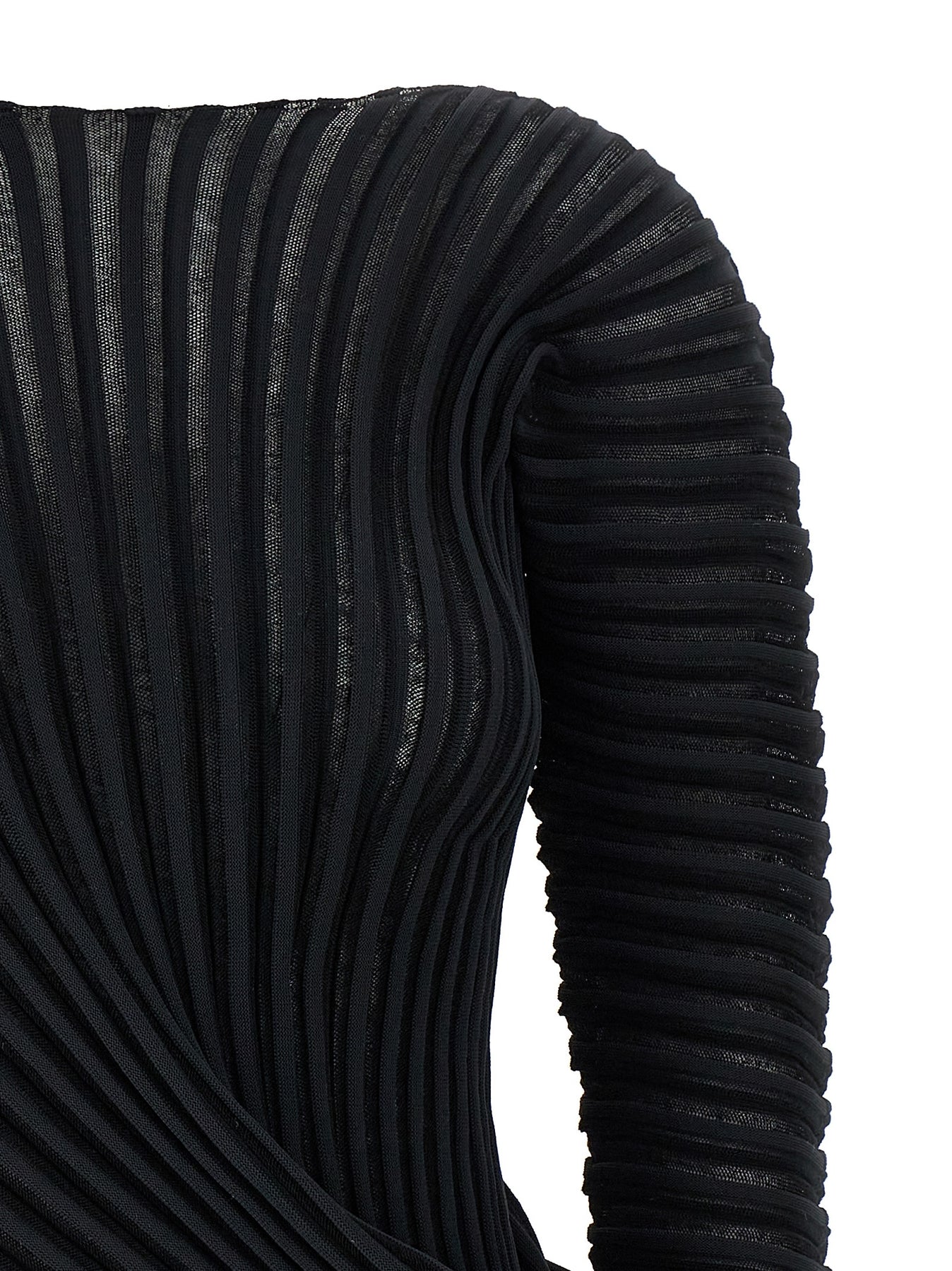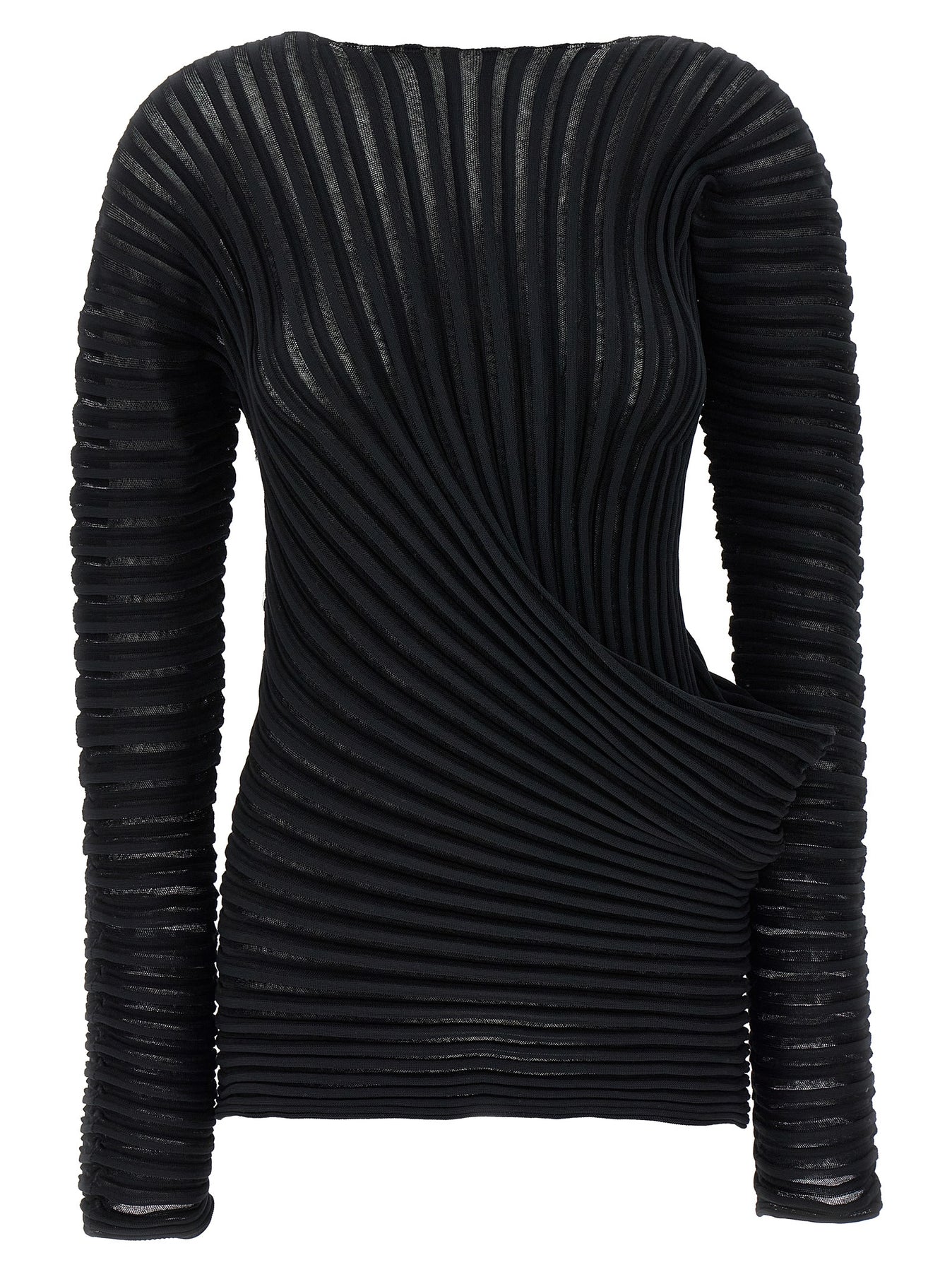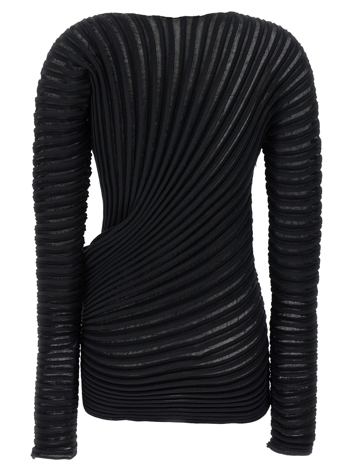 'Stream' pleated knit top, asymmetrical, crew neck.