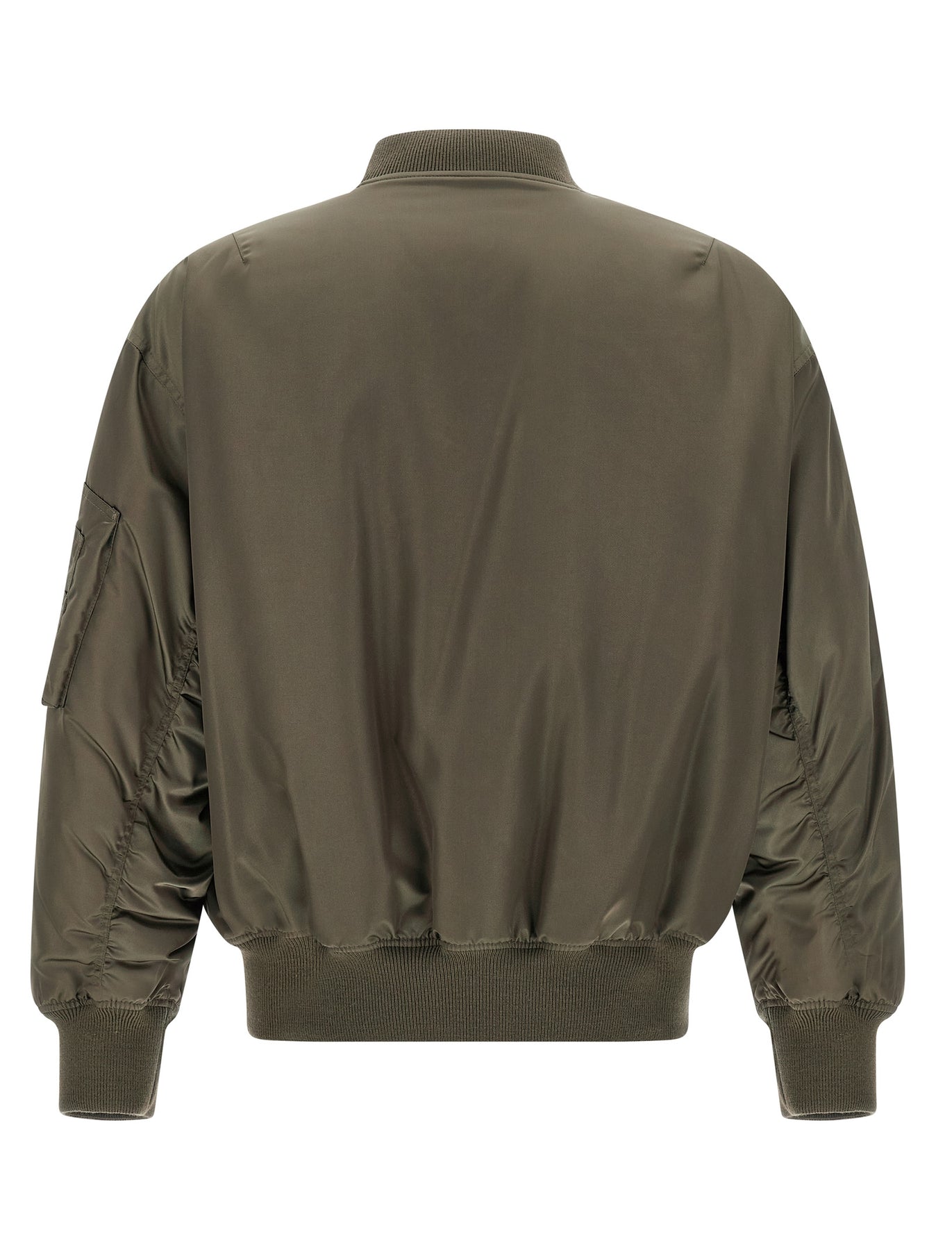 Water-repellent nylon serge bomber jacket with ribbed stretch knit details, front zip closure, pockets, long sleeves with cuffs and dropped shoulder, viscose and cotton blend lining.