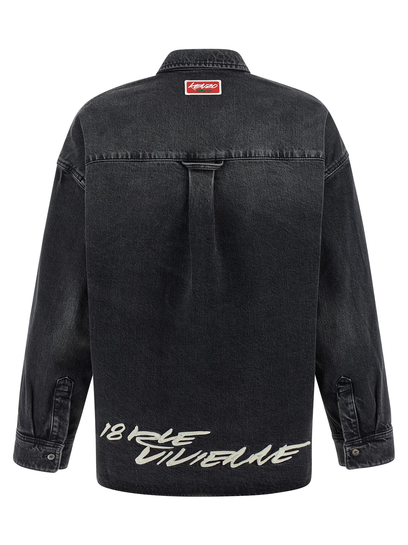 Japanese stone bleach wash denim shirt, workwear model, embroidery and 'Kenzo x Futura 2000' patch on the front and back, front button closure, long sleeves with cuffs and dropped shoulder.