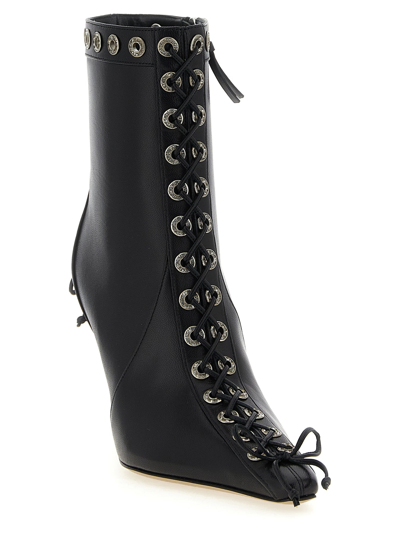 'Crystalized Corset' leather ankle boots with cut-out studs and rhinestones, pointed model with lace detail, side zip closure, heel, leather sole.