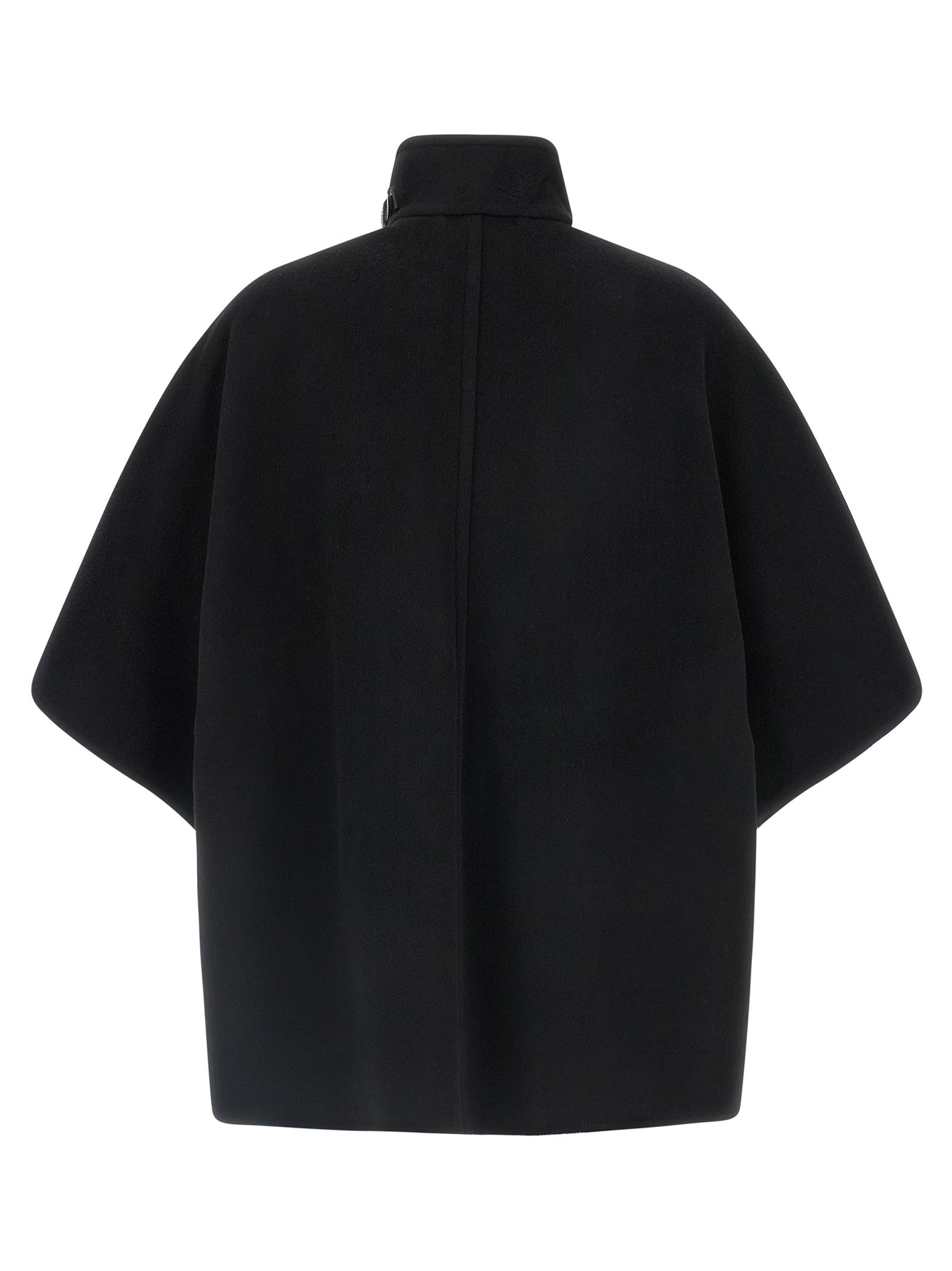 'Derrik' cape in double cashmere drap, slightly flared line, crater collar with leather strap closure, short wide kimono sleeves, front asymmetrical button closure, pockets, deep side slits with button.