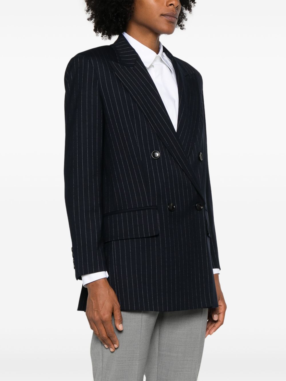navy blue virgin wool blend twill weave pinstripe pattern double-breasted button fastening peak lapels long sleeves buttoned-cuff sleeves chest welt pocket two side flap pockets English rear vents logo-jacquard lining straight hem