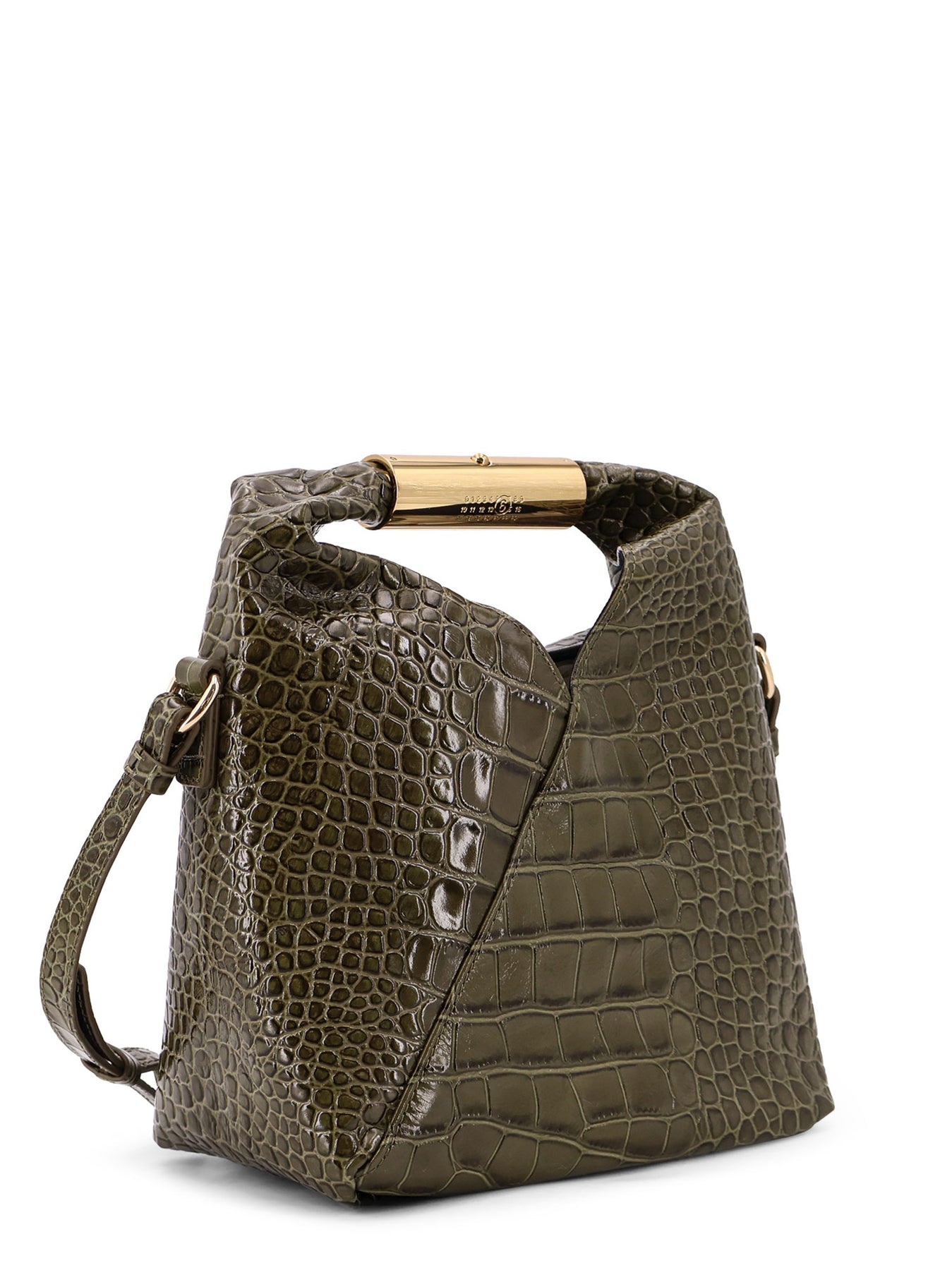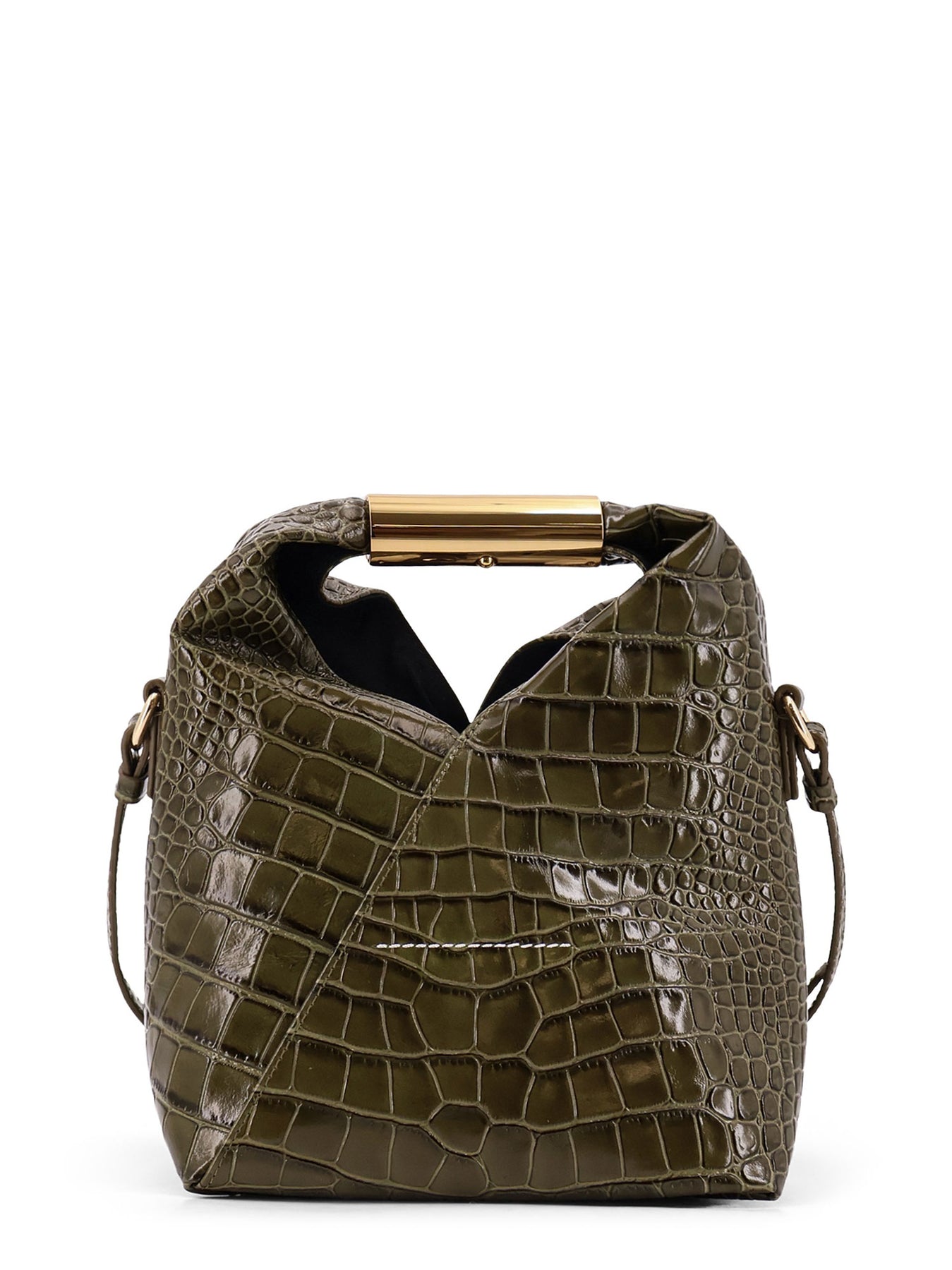 Metal handle with engraved logo Snap-button closure Removable and adjustable shoulder strap Crocodile print Leather W: 29 cm, H: 23 cm, D: 15 cm SKU:SB6WD0042P8650T7415