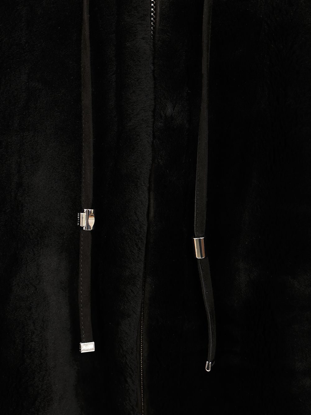 Zip closure with two-way pull. Suede drawstring with metal details. Nylon hood. Padded interior detail. Removable padded sleeve. Shearling/Nylon.