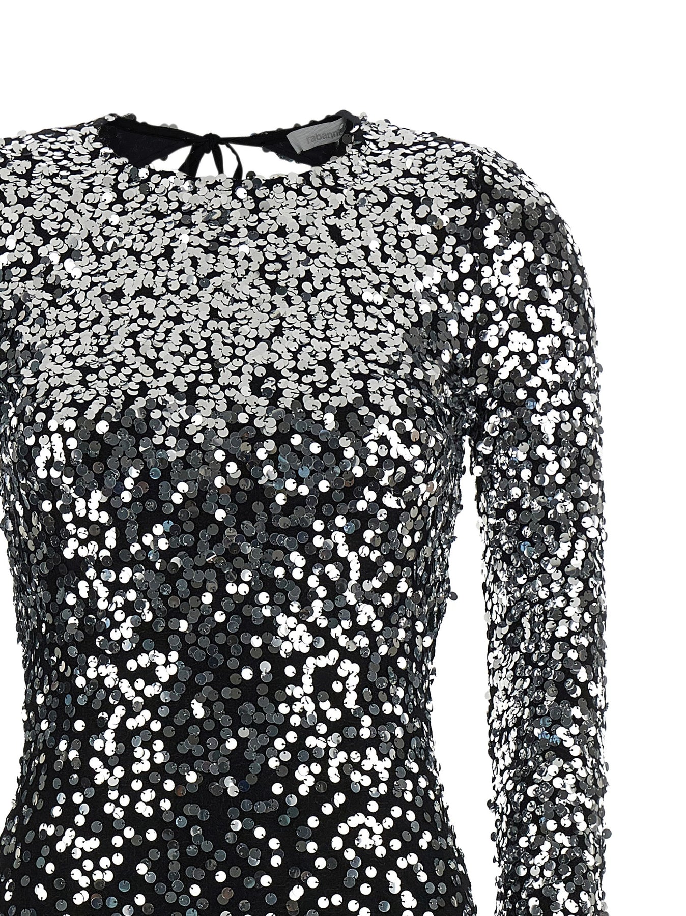 Long dress in second-skin stretch jersey with all-over sequin appliqué, round neckline with drawstring to tie behind the neck, long sleeves, lining, wide back cut-out with bare back.