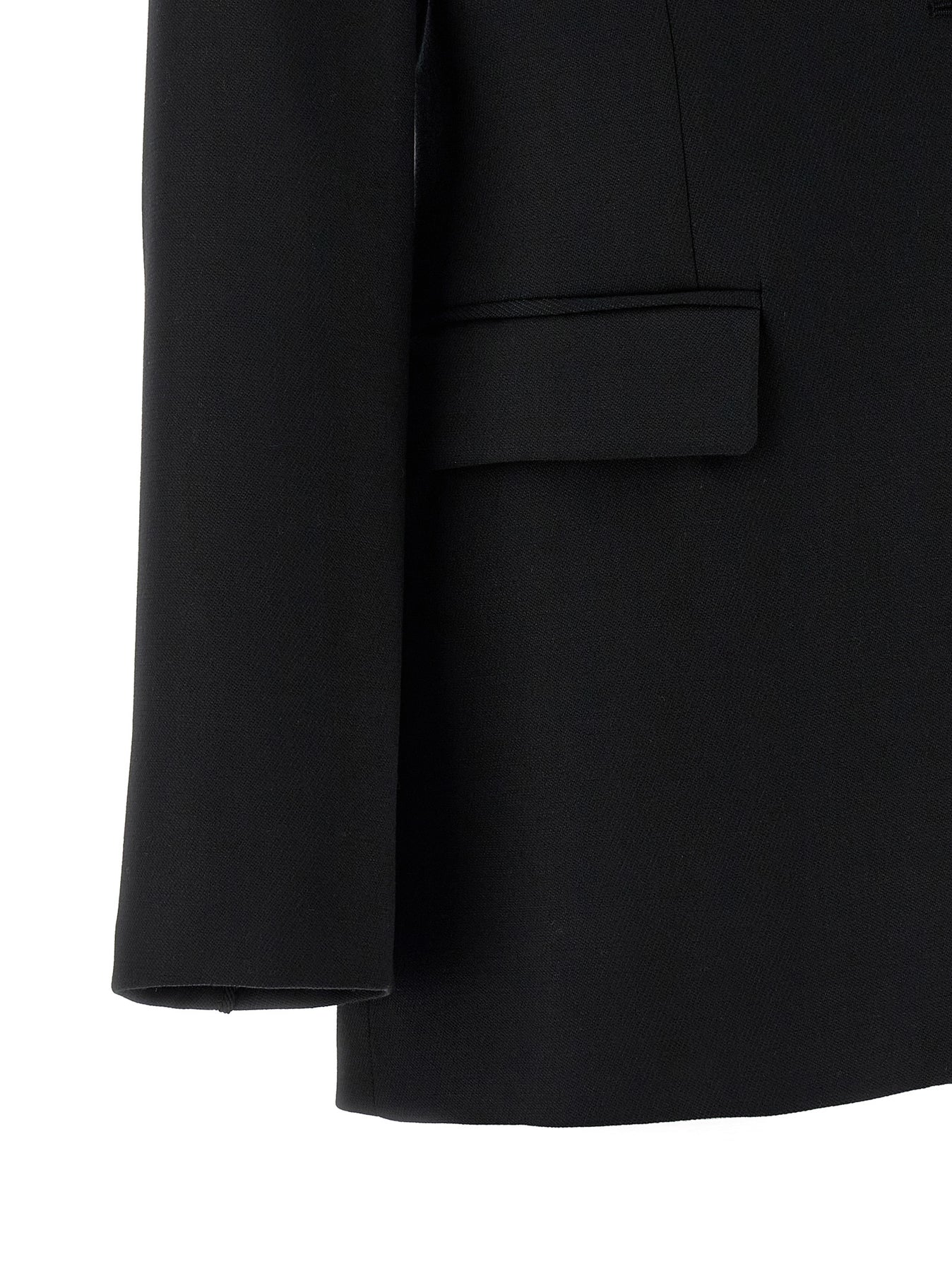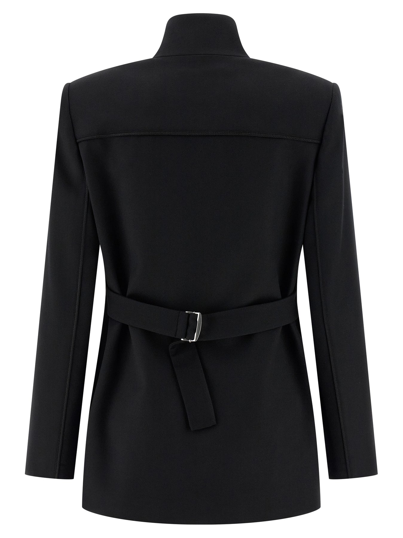 Fausta' single-breasted blazer in wool flannel and viscose with tone-on-tone trimming details, front button closure, lapel collar, breast pocket, flap pockets, padded shoulder, long sleeves, and adjustable back belt.